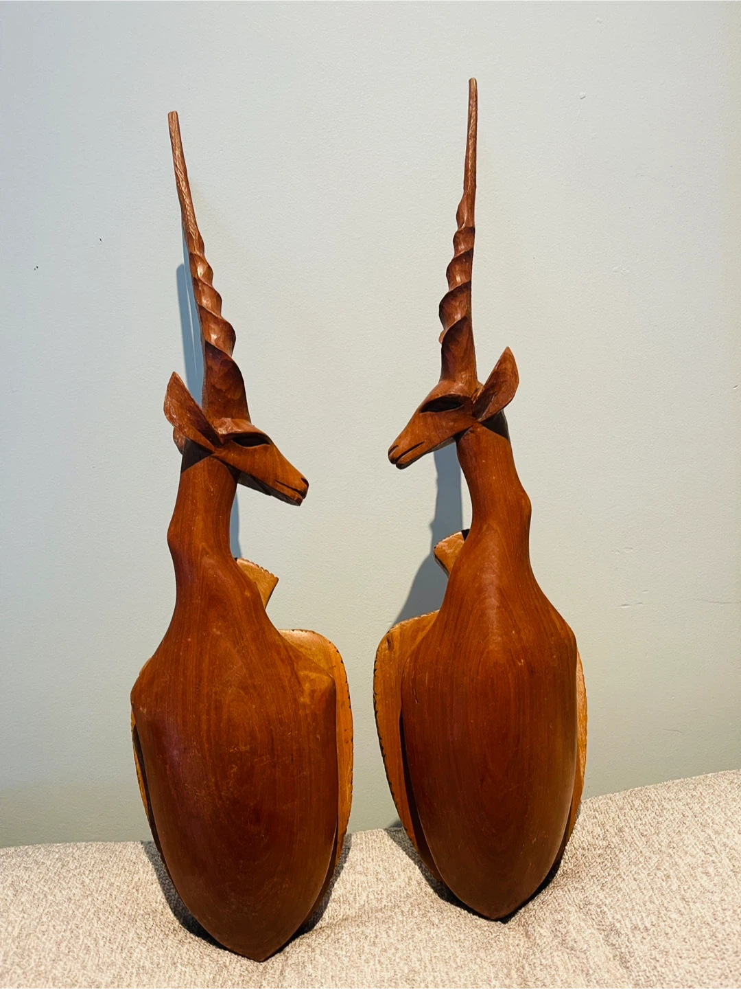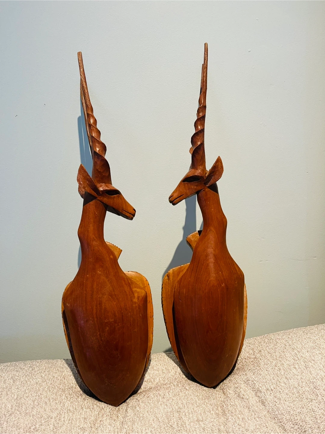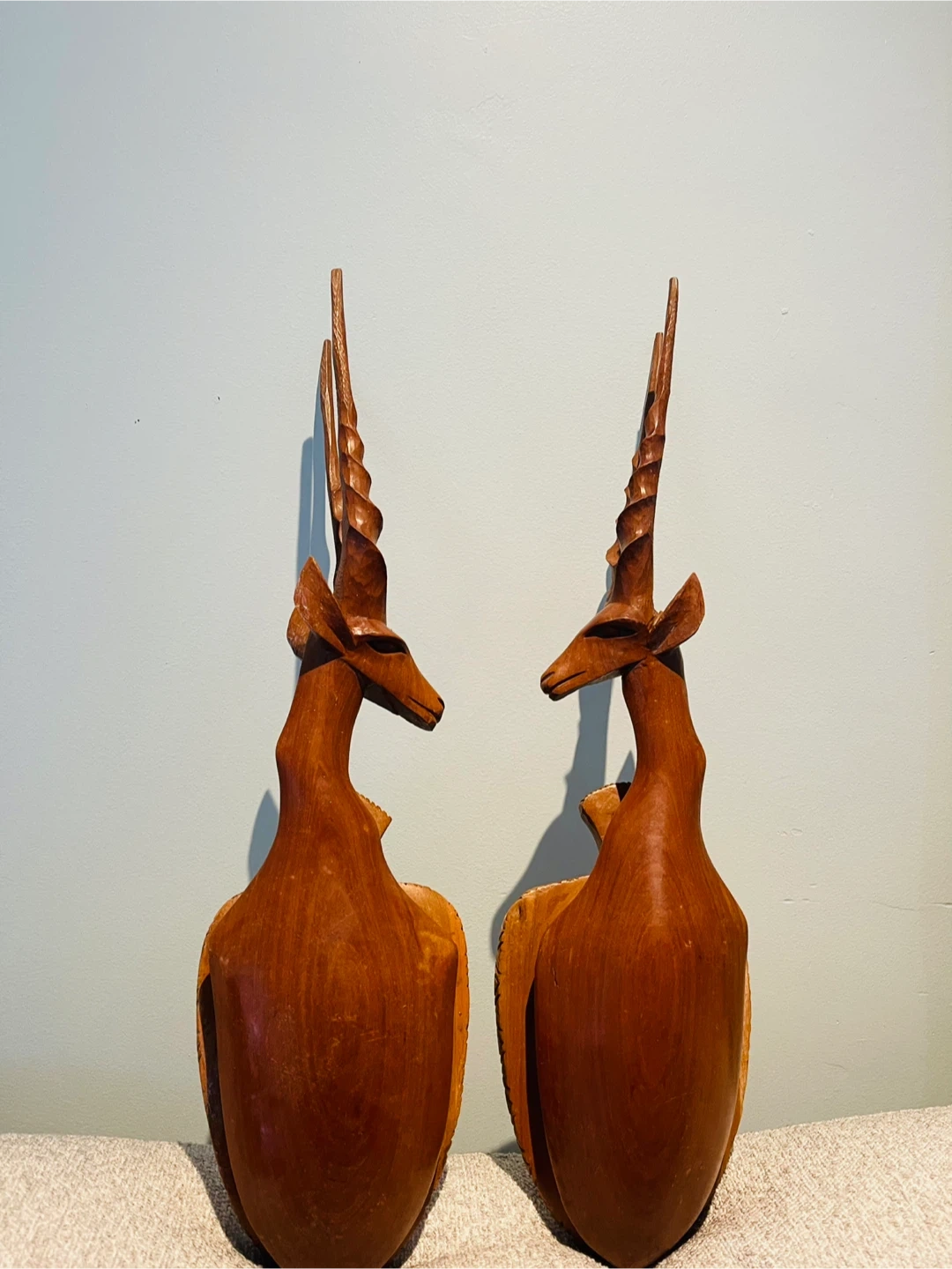 Two intricately carved wooden antelopes with spiralled horns. These decorative pieces are made of polished wood. They'd add a unique touch to any room's decor. Perfect for display on a shelf or mantel.