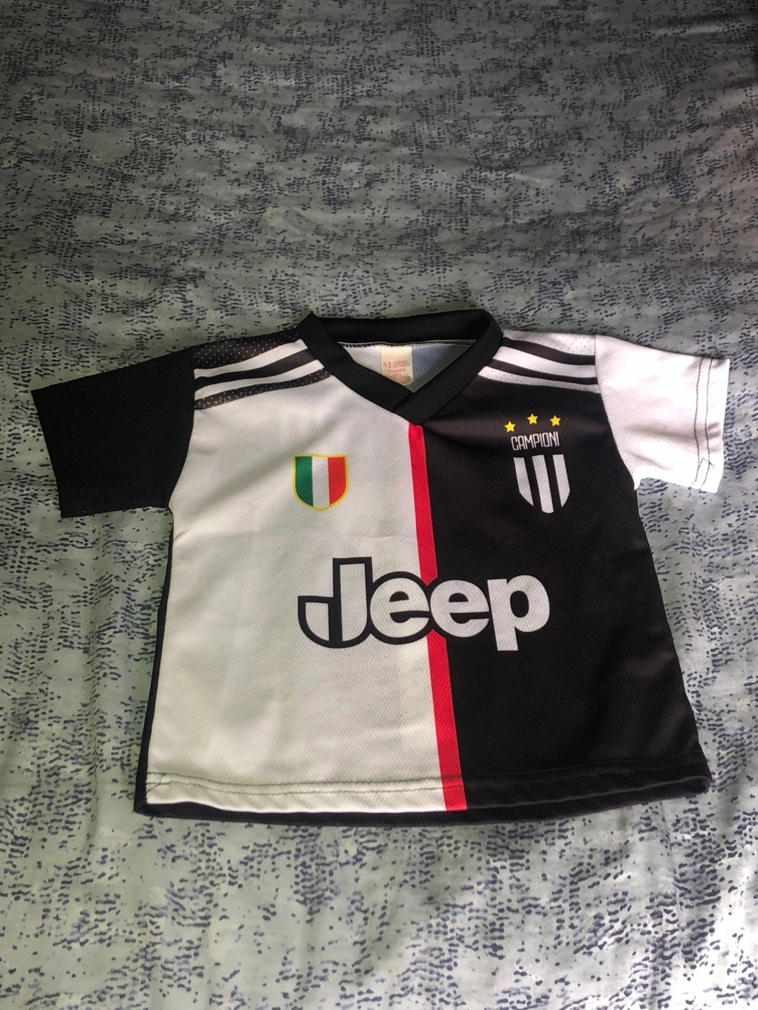 Selling a Cristiano Ronaldo Juventus jersey! It features the iconic black and white design with Ronaldo's name and number 7 on the back. The front has the Jeep logo and Juventus emblem. Perfect for any young football fan! Age 2 years