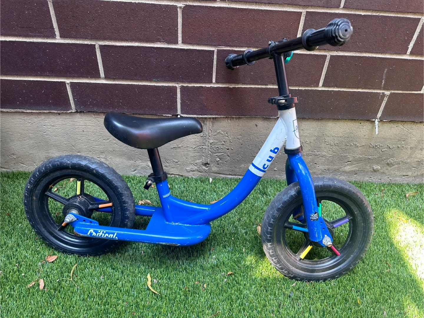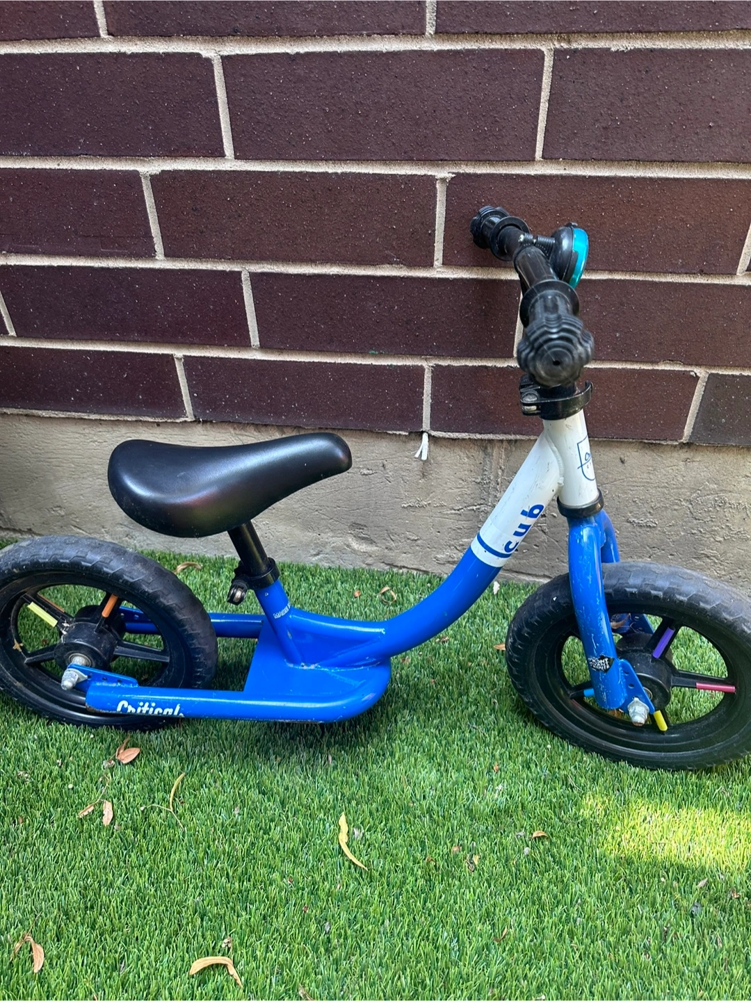 Selling a Critical Cub balance bike in blue! It's perfect for helping your little one learn to balance before transitioning to a pedal bike. It has some wear and tear, but it's still in good working condition and ready for its next adventure
