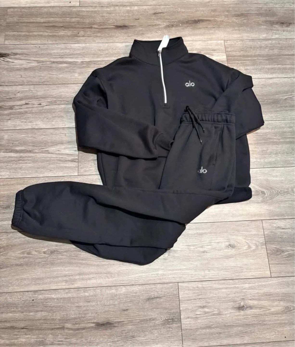 This Alo tracksuit set includes a black half-zip sweatshirt and matching sweatpants. Both pieces feature the subtle 'alo' logo. They're made from a comfortable fabric, perfect for casual wear or post-workout comfort.