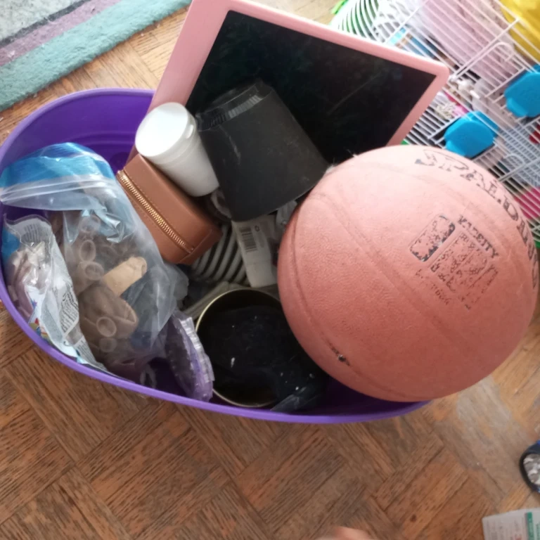 This purple Halloween-themed bin's filled with various items including a basketball, a decorative crow, and some personal care products. It's a fun mix of decorations and useful items all in one container. Great for a Halloween party or as a unique gift!