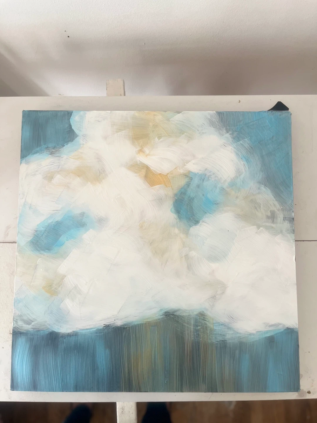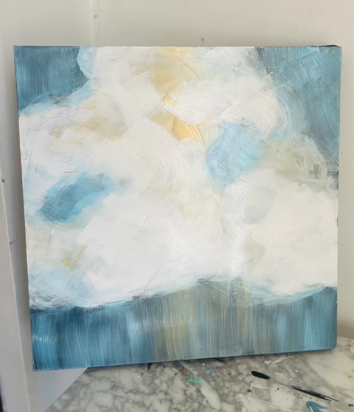 Hand painted Abstract painting featuring soft, blended colours reminiscent of clouds. It's on a canvas with painted edges. Perfect for adding a serene touch to any room!