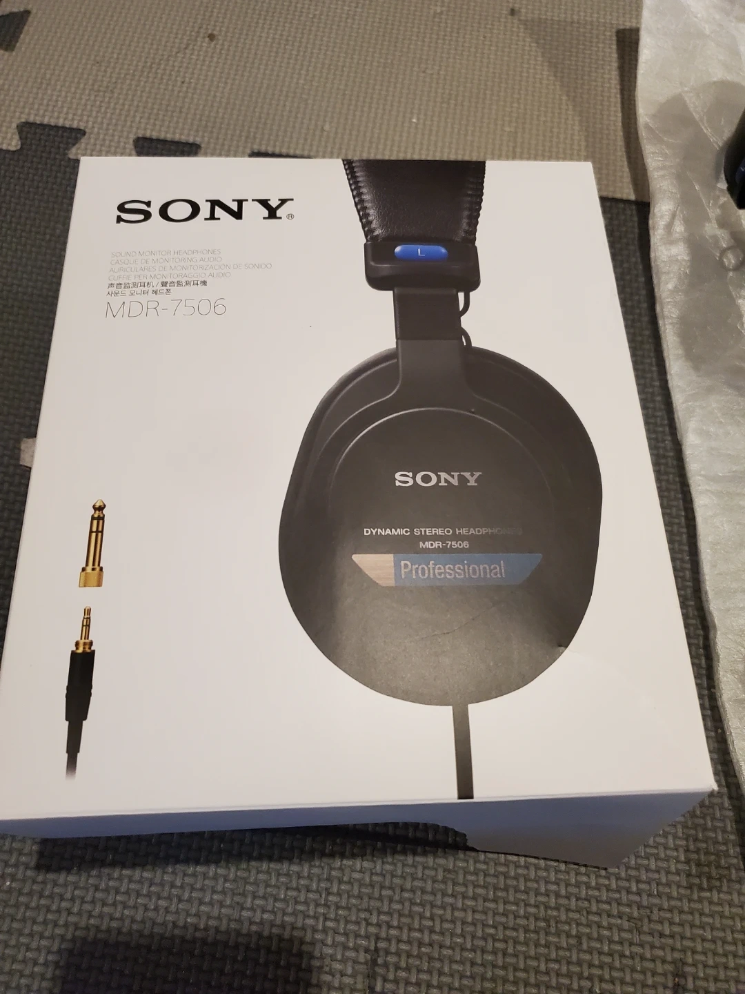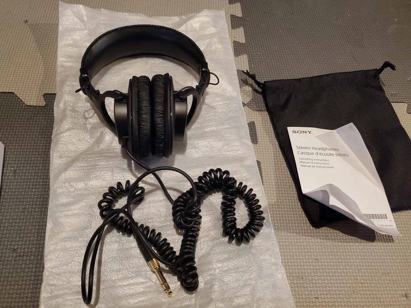 Sony MDR-7506 dynamic stereo headphones. Professional model with a coiled cable and gold-plated adapter included. These headphones are black.