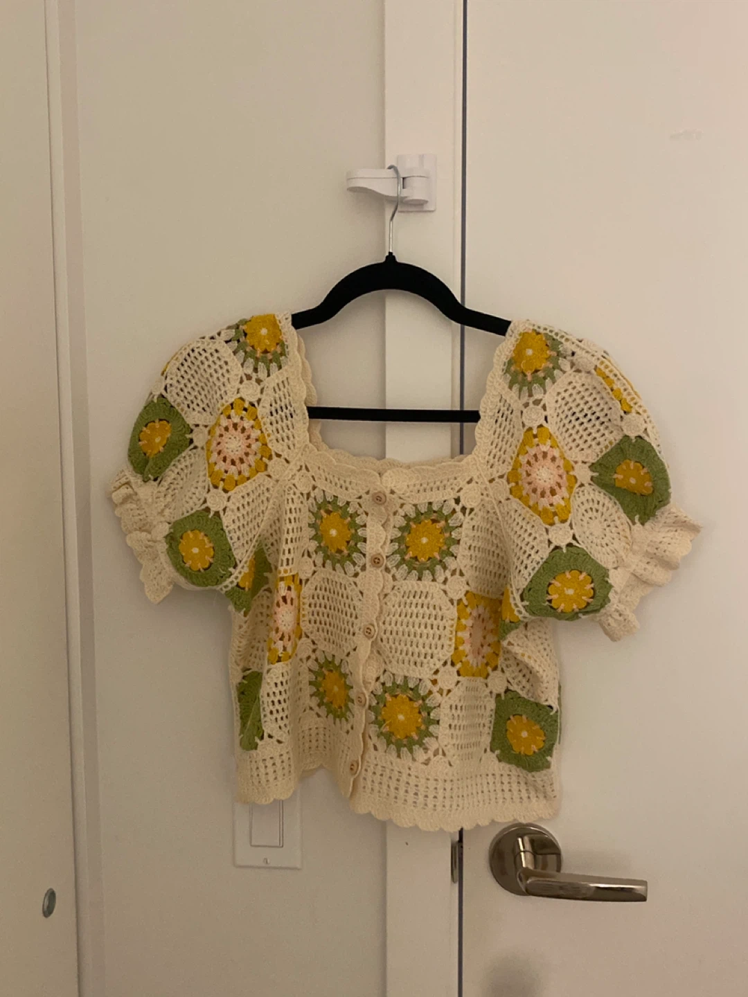 15Super cute crochet top with a floral pattern! It's in great condition and features a unique, handmade look. Perfect for adding a touch of vintage charm to your wardrobe