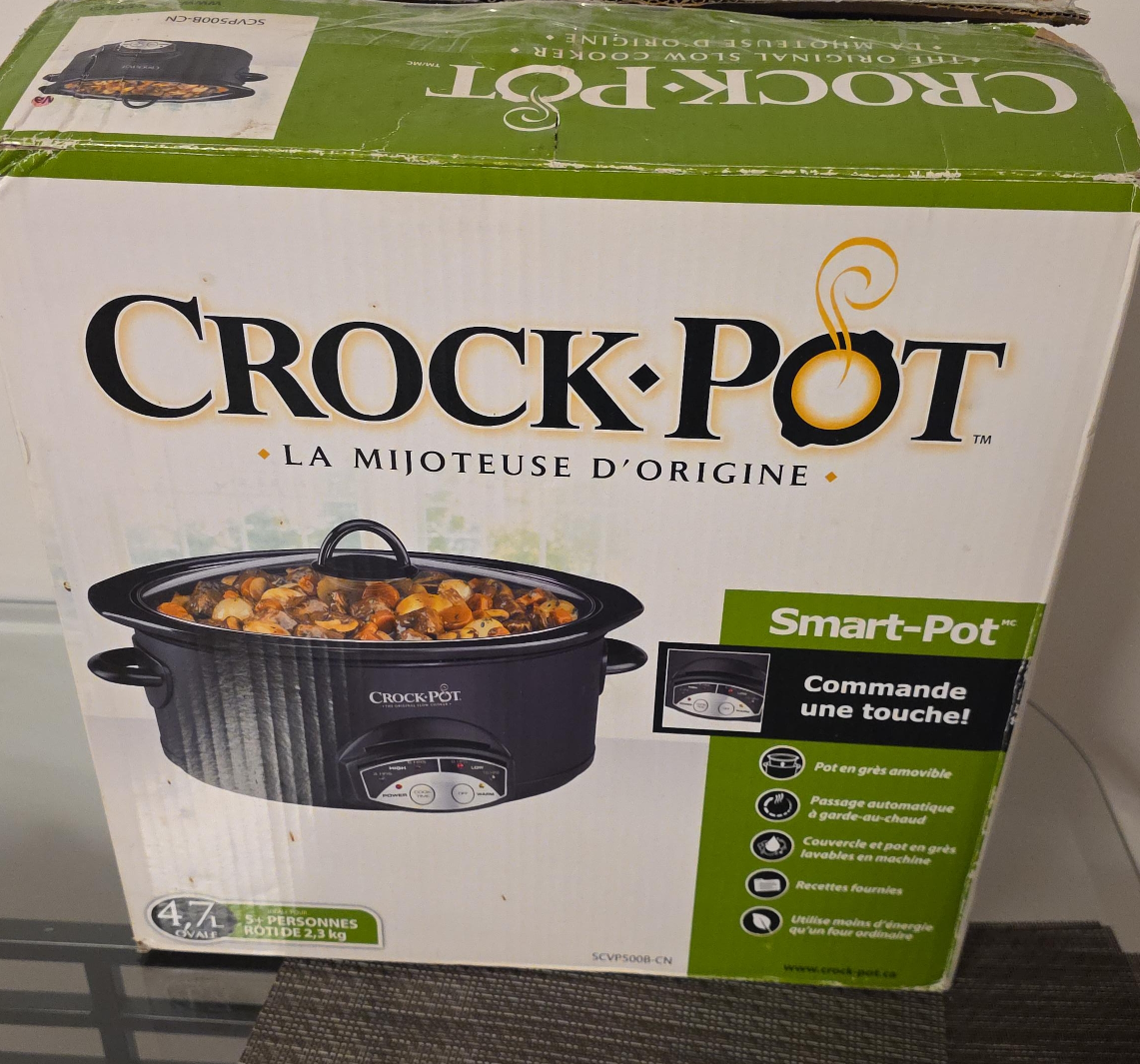 Selling a Crock-Pot slow cooker! It's a 4.7L oval model, perfect for 5+ people or a 2.3 kg roast. The Smart-Pot feature offers one-touch operation. The stoneware pot is removable and both the pot and lid are dishwasher safe. It also uses less energy than an oven