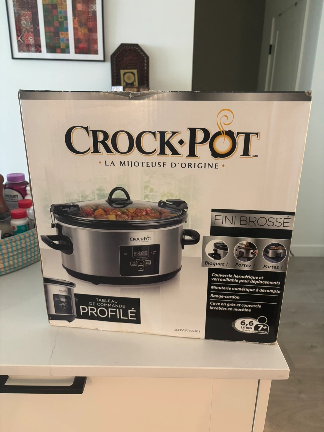 Selling a brand new Crock-Pot slow cooker! It's still in its original packaging. This model features a brushed finish and a digital timer. The stoneware pot and lid are machine washable. It has a 6.6L capacity, perfect for 7+ people!