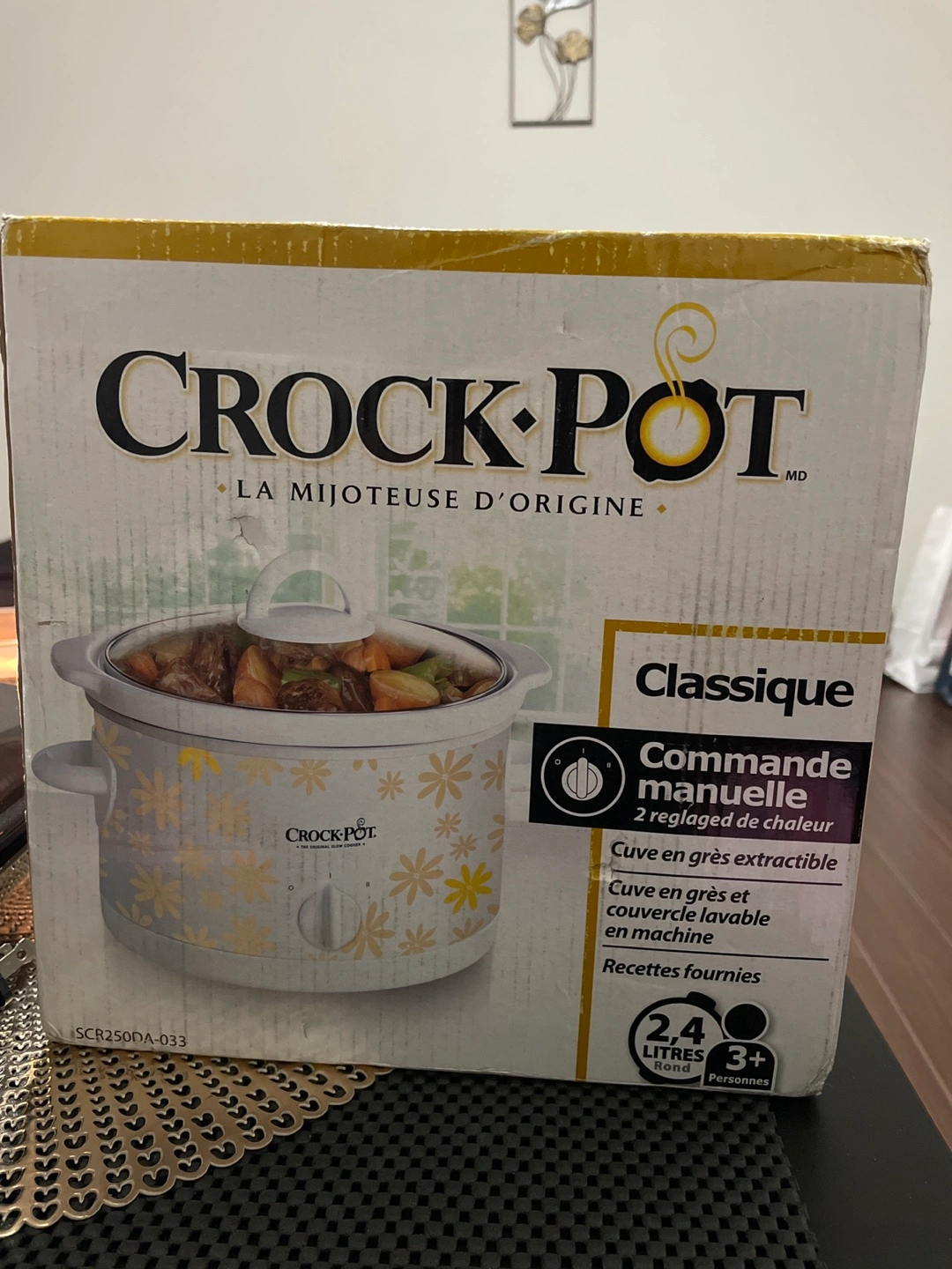 60Manual control, 2 heat settings. Removable stoneware pot and lid, dishwasher safe. Recipes included. 2.4 litre capacity, serves 3+. Brand new sealed.