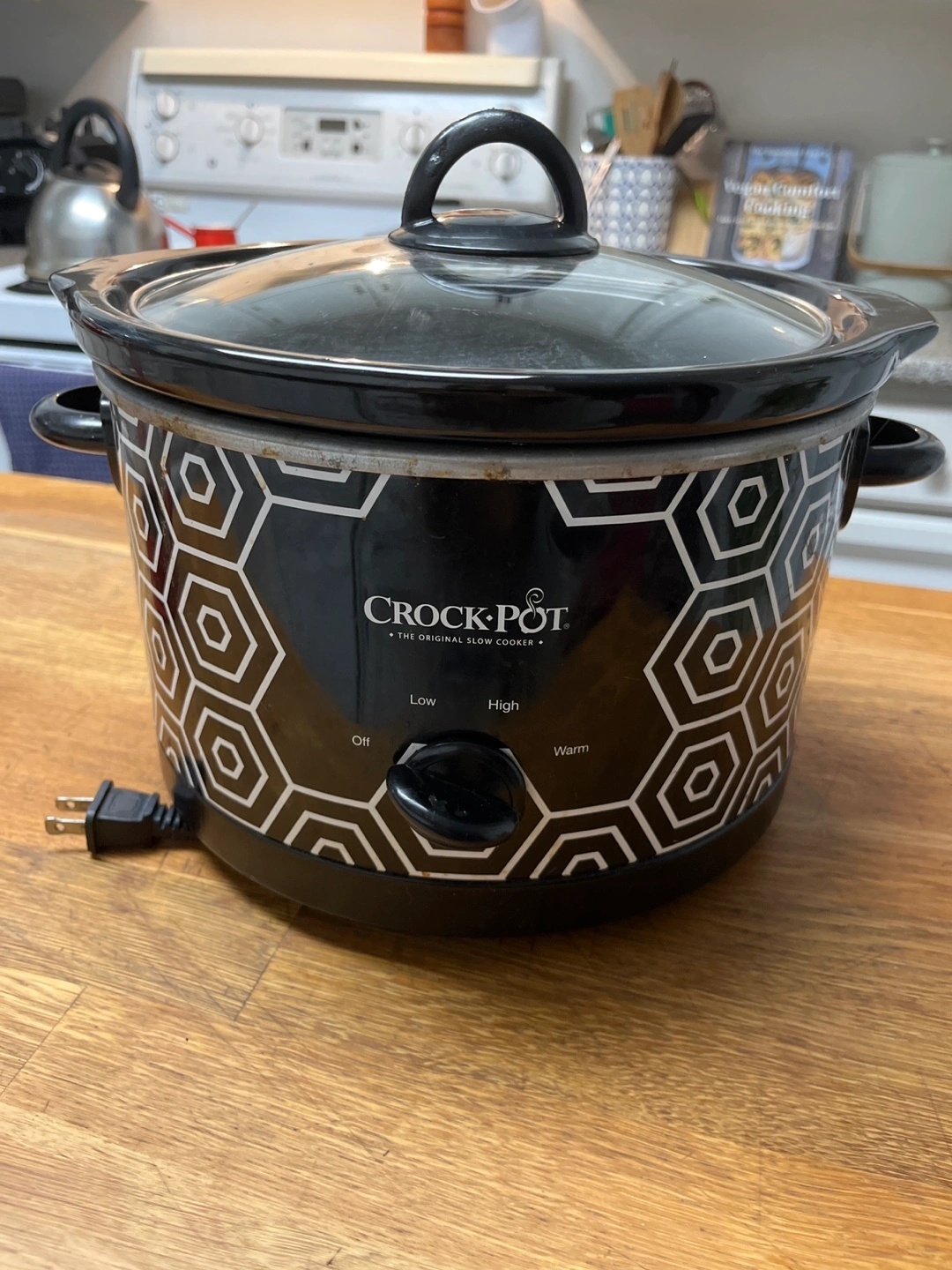47Black and white slow cooker with a geometric pattern. Has a glass lid.