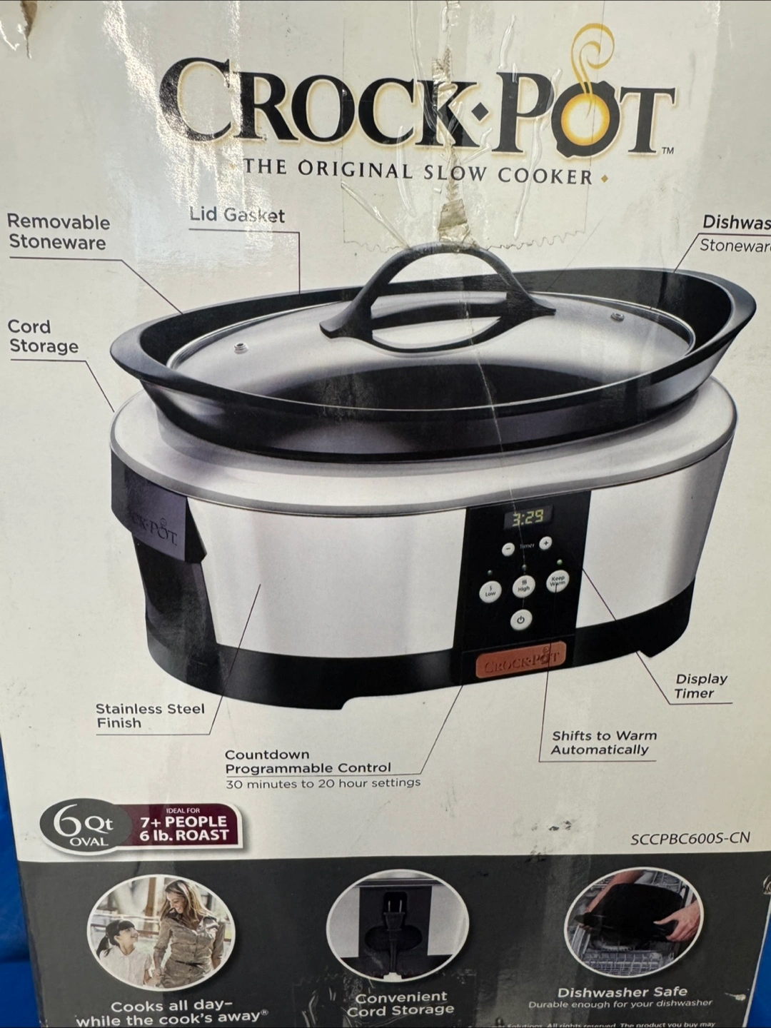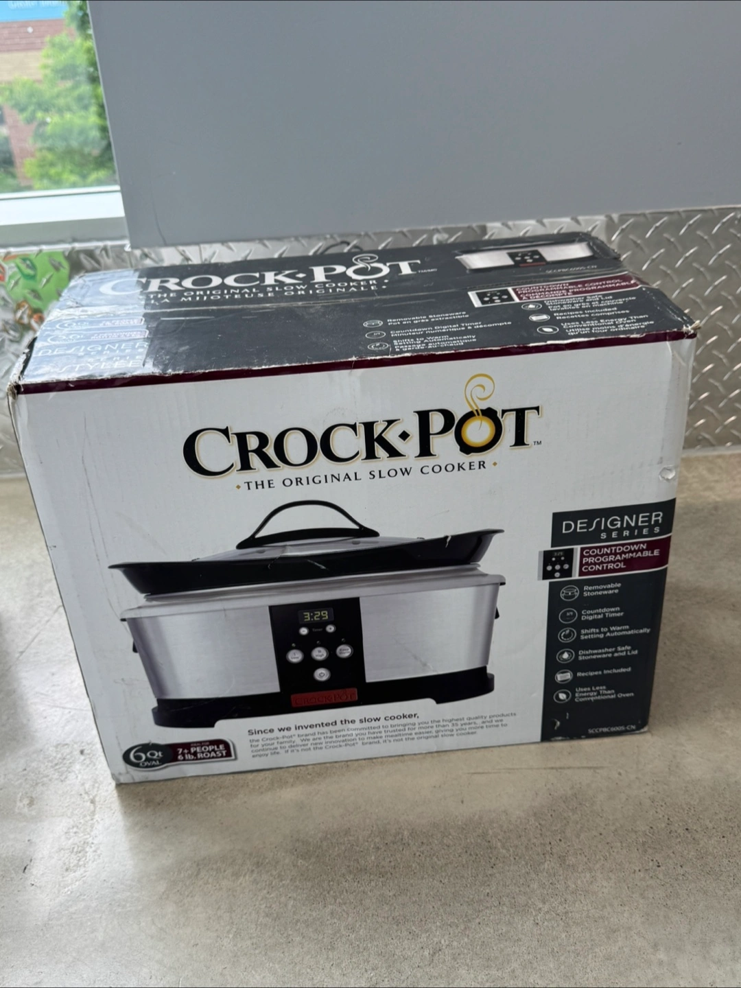 18Selling a Crock-Pot, the original slow cooker! This model is a 6-quart oval shape, perfect for 7+ people or a 6 lb roast. It features programmable controls, uses less energy than a conventional oven and automatically shifts to warm when cooking is complete. The stoneware is removable and dishwasher safe for easy cleaning. Includes a display timer and convenient cord storage. Box included!