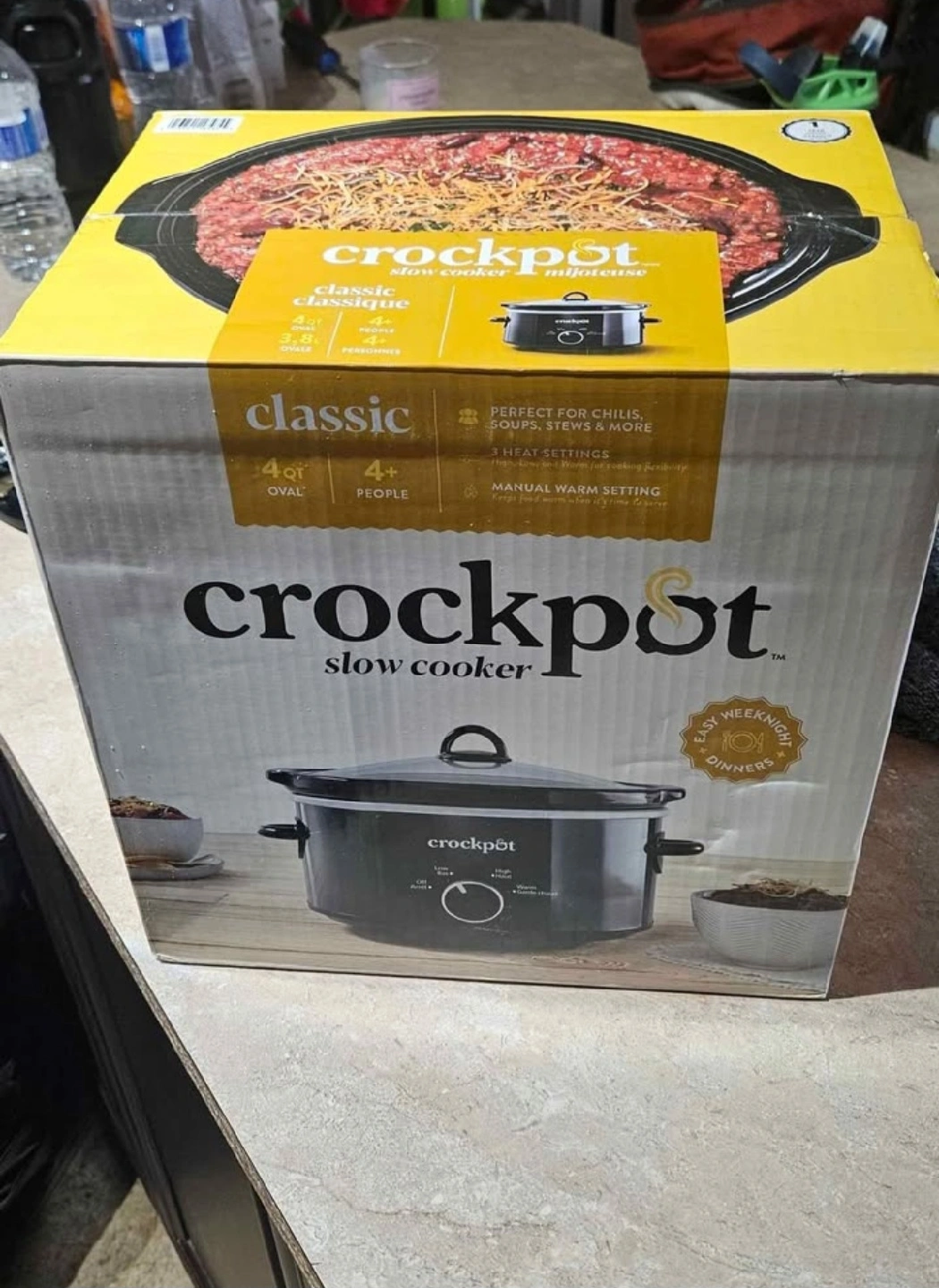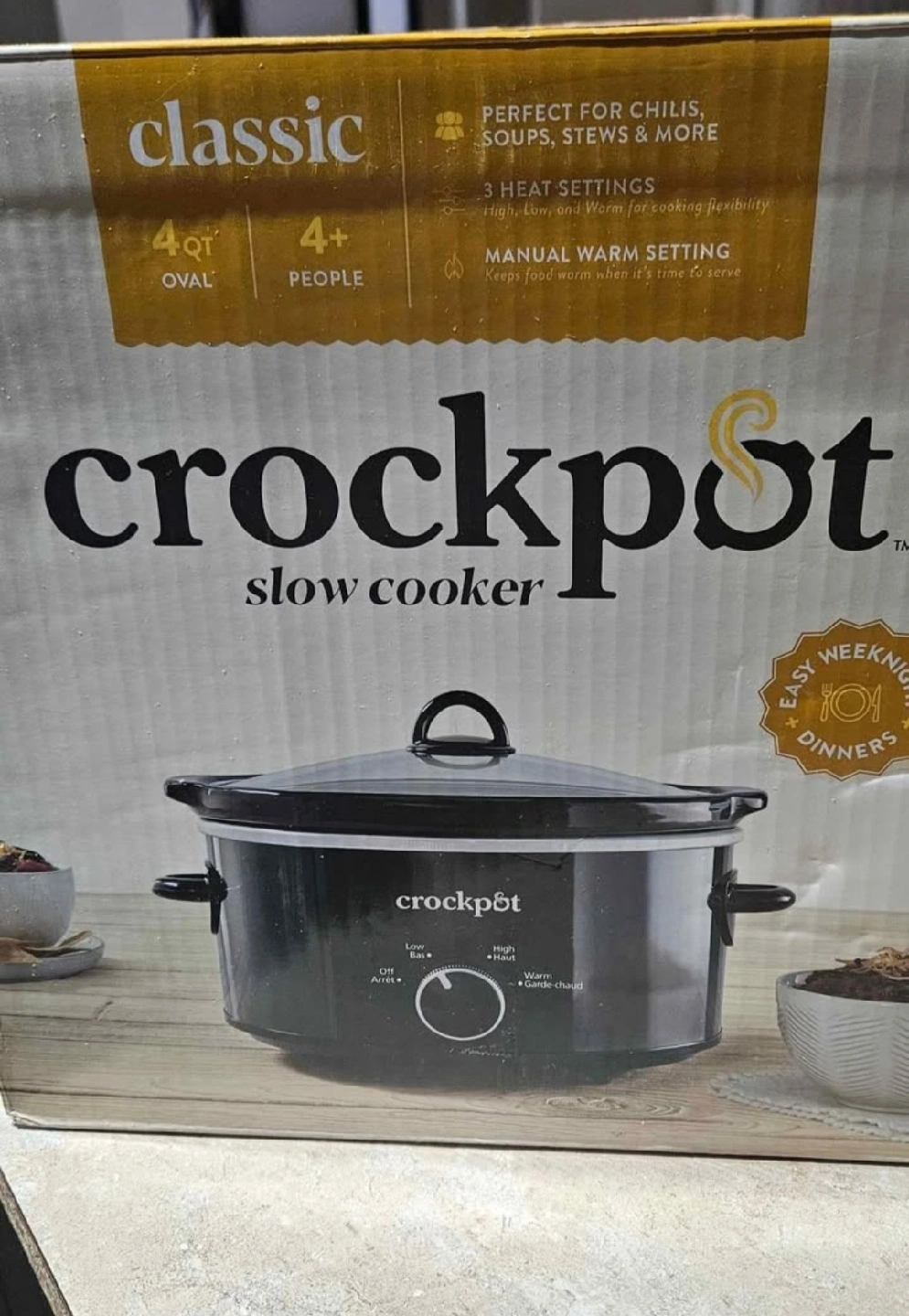 68Selling a Crockpot slow cooker, classic series! It's a 4QT oval shape, perfect for chilis, soups, stews & more. It has 3 heat settings (high, low, and warm) for cooking flexibility. It also has a manual warm setting to keep food warm when it's time to serve!