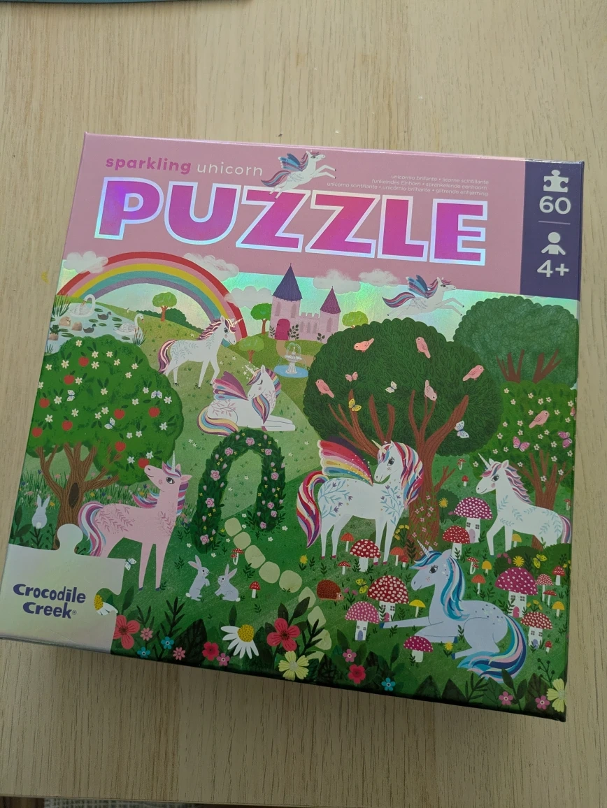 10Selling a Crocodile Creek Sparkling Unicorn Puzzle! This puzzle has 60 pieces and is recommended for ages 4+. It's in great condition and ready for a new home!