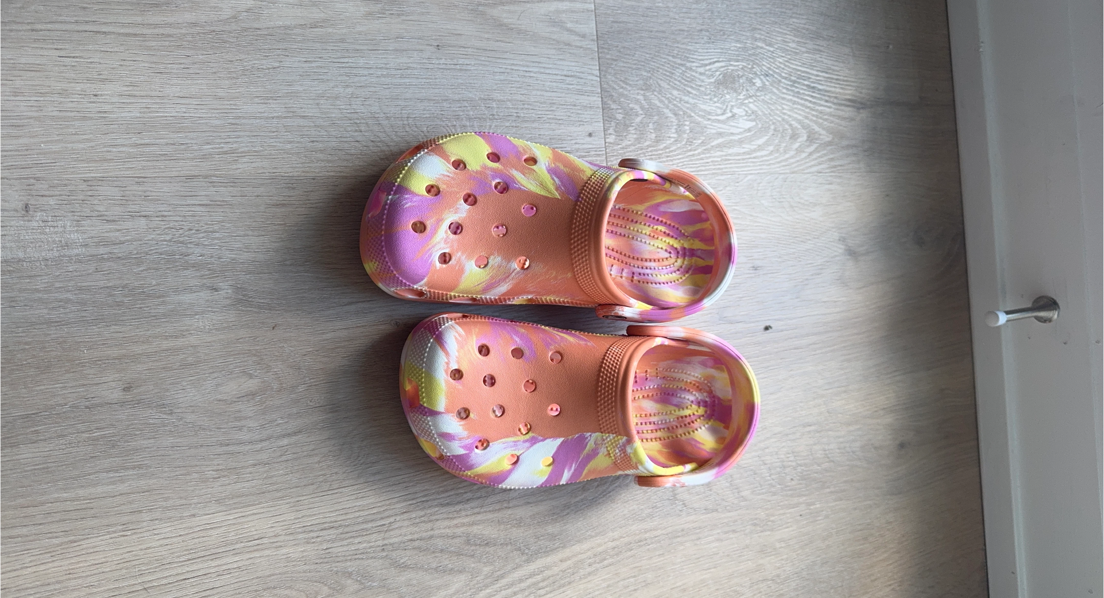 5Crocs Classic Clogs in a fun, colourful pattern! Only worn once. M6/W8