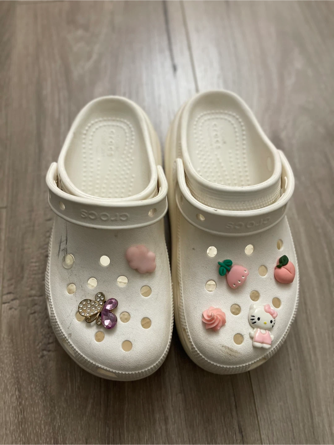 10Selling a pair of Crocs Classic Clogs in size J3. They're white and have some cute charms on them! There are some signs of wear, as you can see in the photos.
