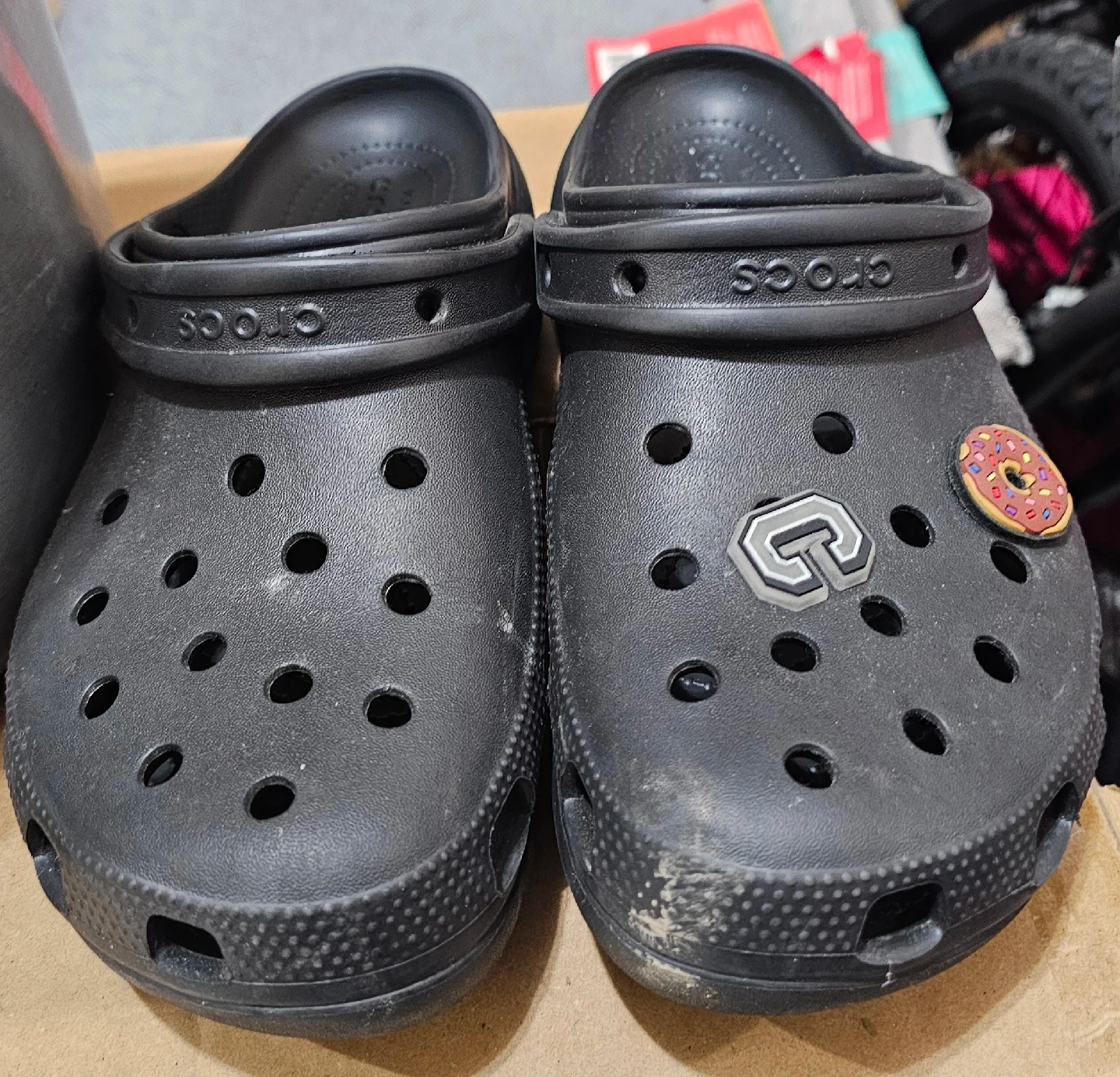 10Selling a pair of black Crocs Classic clogs in size 9. They have a few charms on them, including a donut and a letter 'G'. They're in used condition, with some signs of wear, as pictured