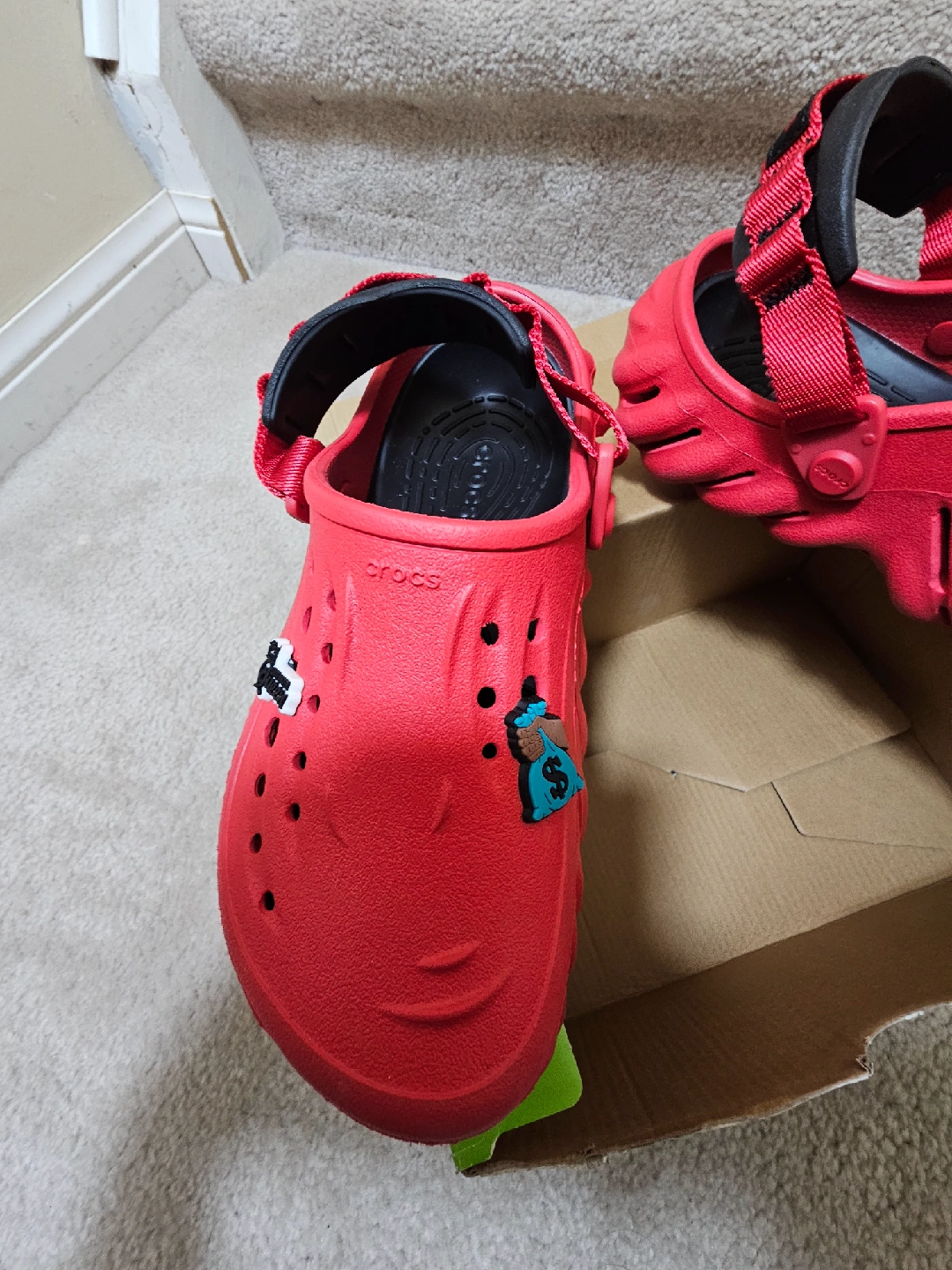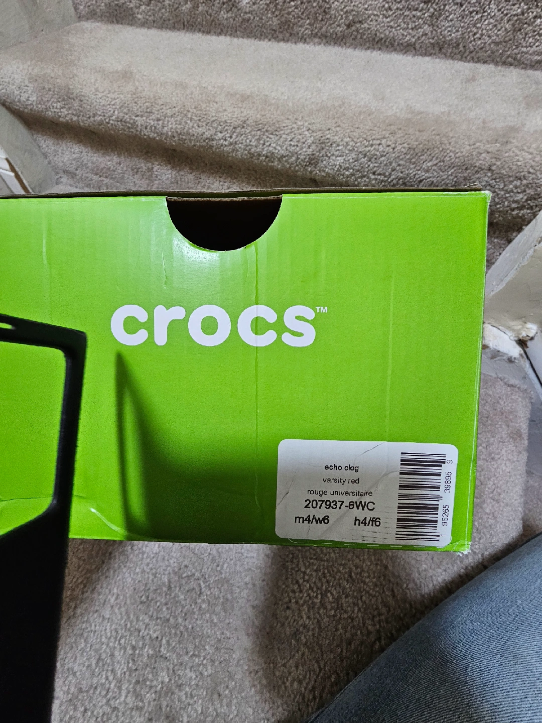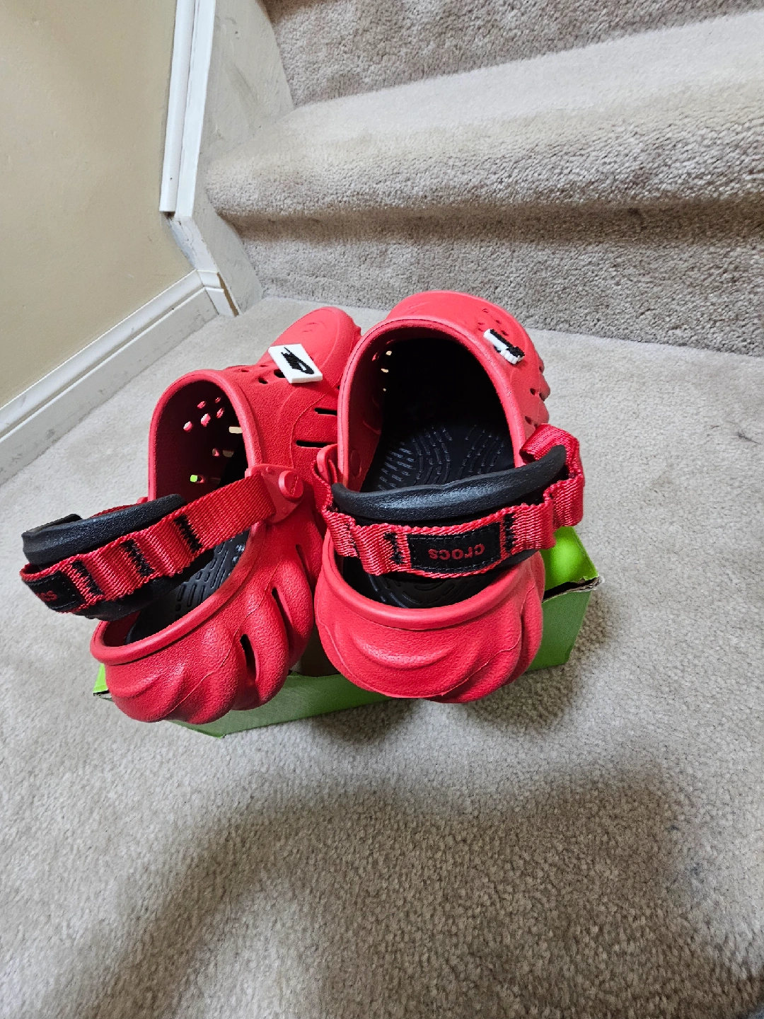 91Selling a pair of Crocs Echo Clogs in Varsity Red! They come with a few fun jibbitz to add some personality. These are size M4/W6 and come in the original box