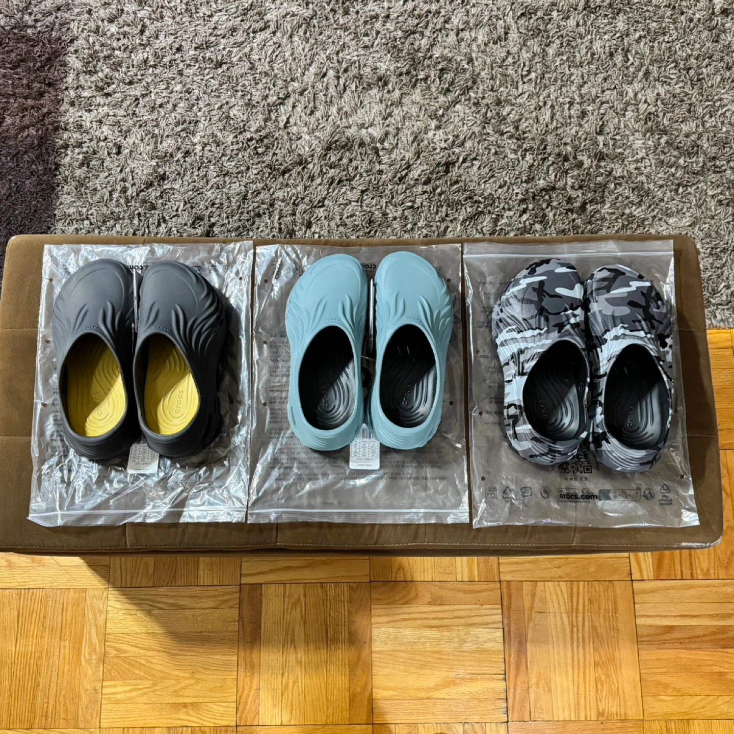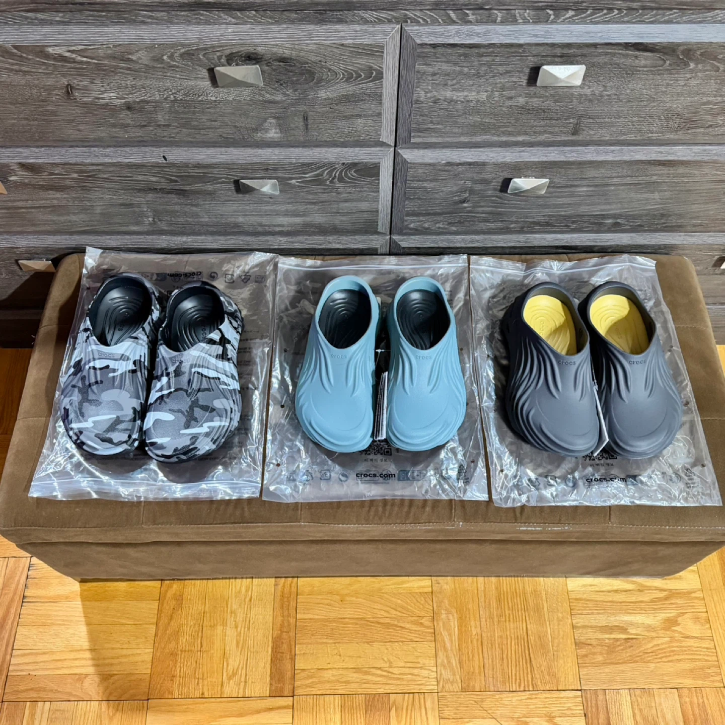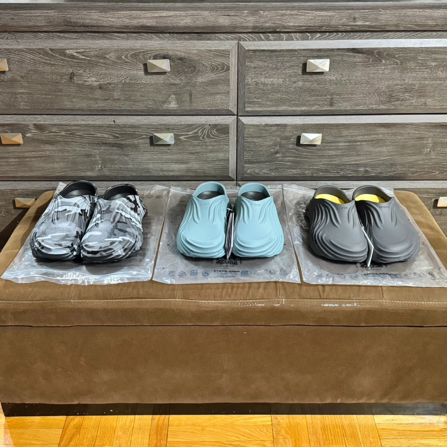137Crocs Echo Wave All are brandnew. These style runs a little big so you might wanna size down from your regular shoe size. These are meant for both mens and womens. Pond/Blue Color - Size M5/W7 Black Color - Size M5/W7 Camo Color - Size M5/W7 , M9/W11 and M10/W12 Selling each pair for $50