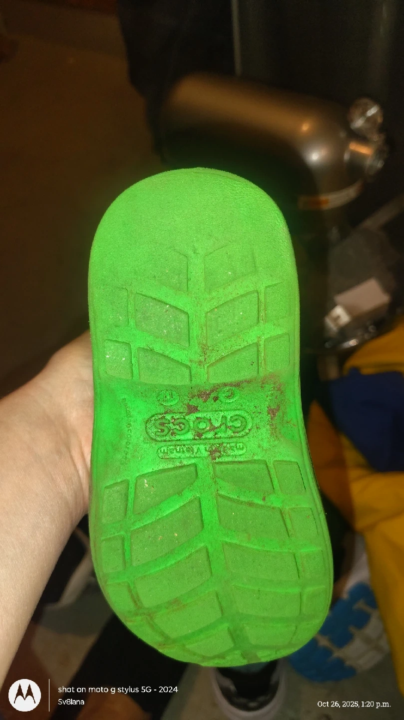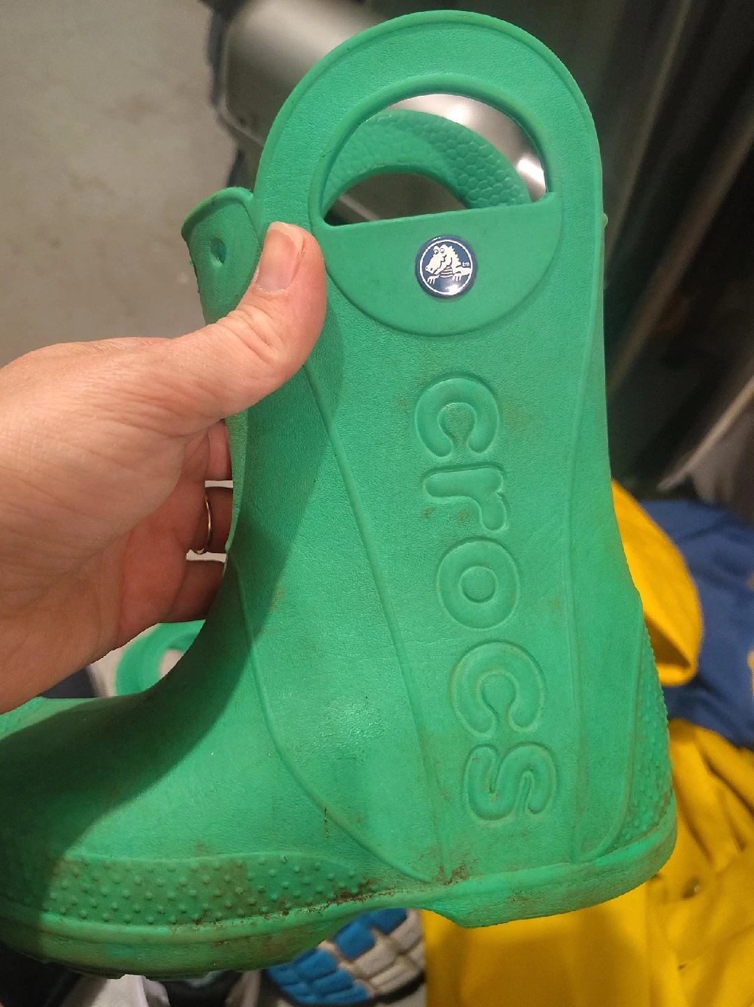 5These are a pair of Crocs Kids' Handle It Rain Boots in a bright green colour! They're a size 11 and have a handy handle for easy carrying. Perfect for little ones splashing in puddles! They are worn but still have a little life in them