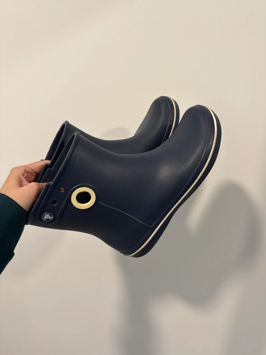 217Selling a pair of Crocs rain boots in navy blue! They're in fine shape and ready for some puddle jumping. Size w9. Not new but a lot of life in them.