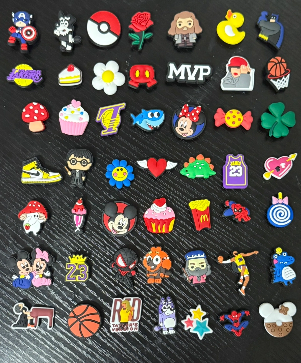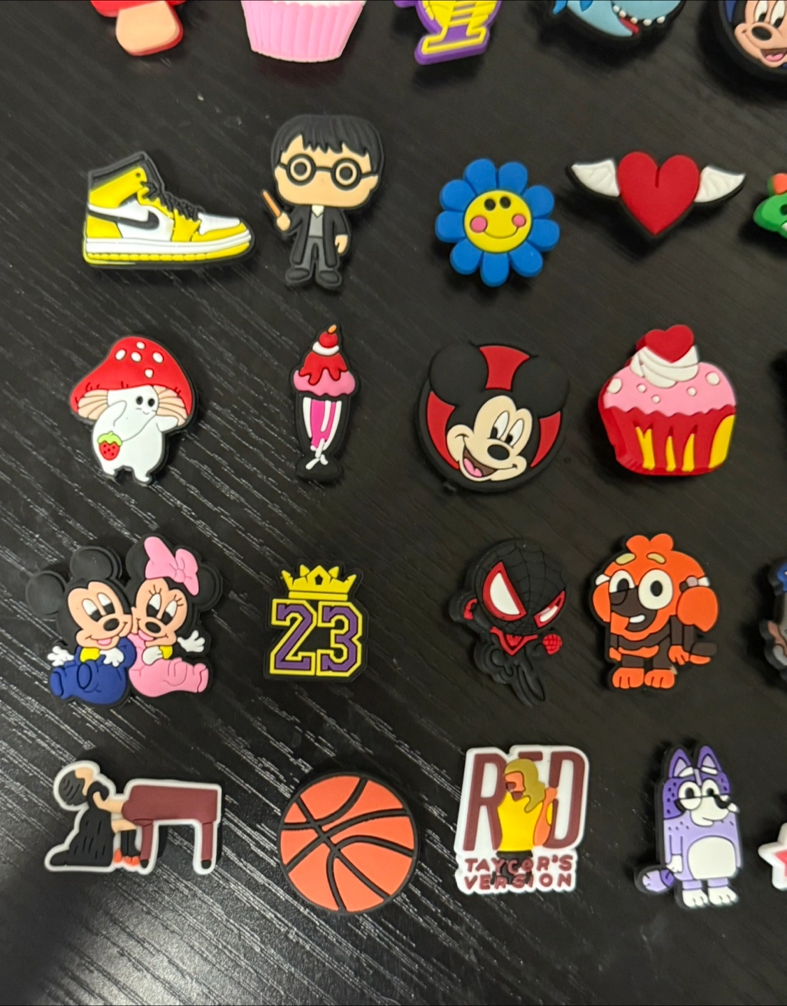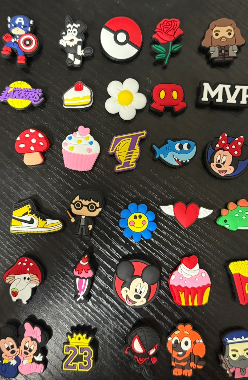 Add some personality to your Crocs, clogs, or shoes with these fun and colorful charms! 🎉 Lots of designs available: ✨ Cartoons (Mickey, Minnie, Spiderman, Bluey, Pokemon, Harry Potter, etc.) ✨ Sports (Lakers, Basketball, #23 Jersey, Sneakers) ✨ Food & Fun (Cupcakes, Fries, Ice Cream, Flowers, Hearts, etc.) ✔️ High-quality soft rubber material ✔️ Easy to insert & remove ✔️ Perfect for kids, teens, and adults ✔️ Mix and match your favorites