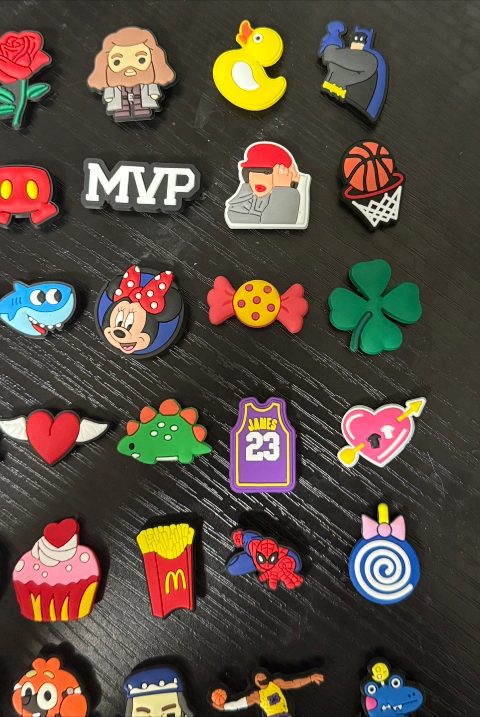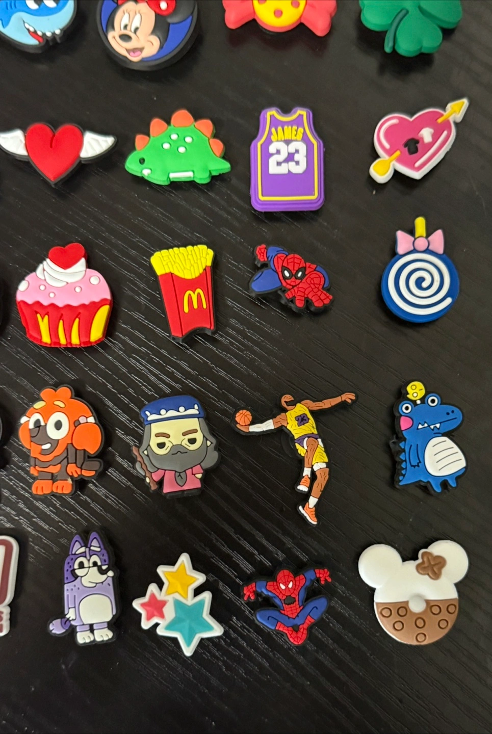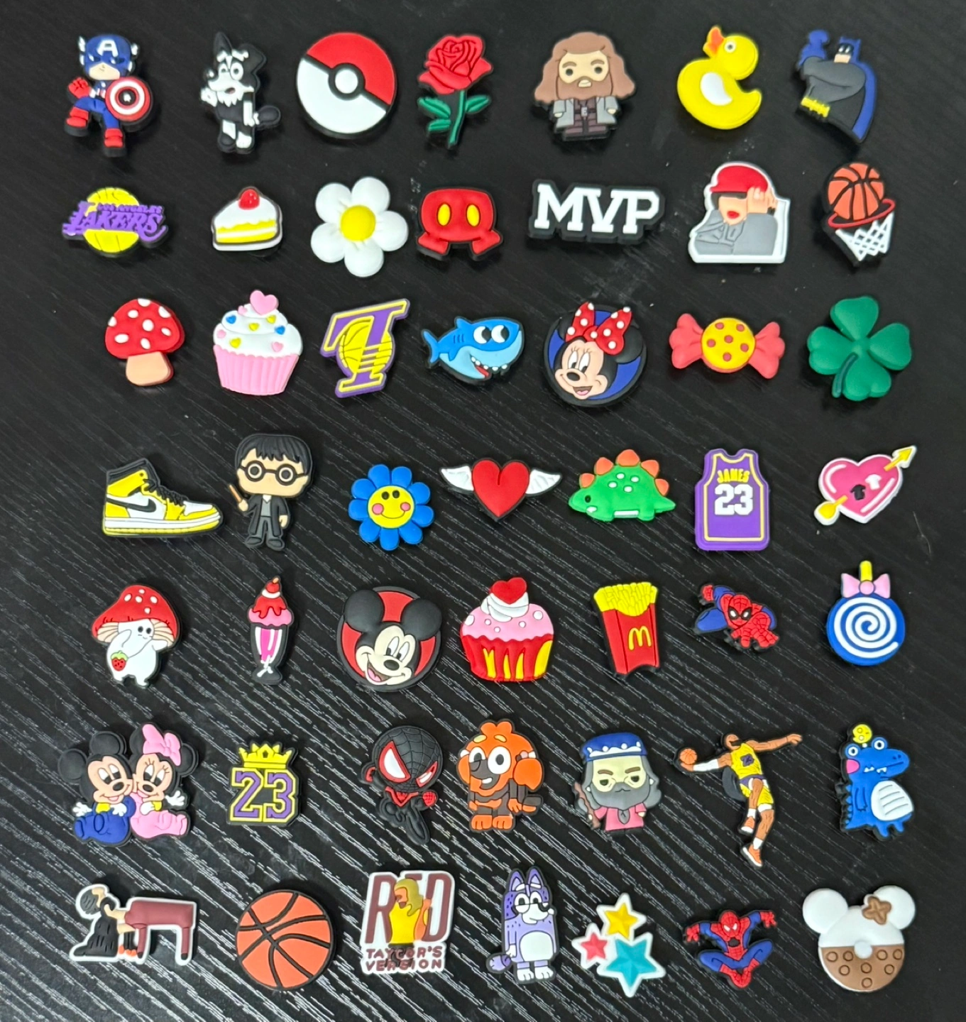 Add some personality to your Crocs, clogs, or shoes with these fun and colorful charms! 🎉 Lots of designs available: ✨ Cartoons (Mickey, Minnie, Spiderman, Bluey, Pokemon, Harry Potter, etc.) ✨ Sports (Lakers, Basketball, #23 Jersey, Sneakers) ✨ Food & Fun (Cupcakes, Fries, Ice Cream, Flowers, Hearts, etc.) ✔️ High-quality soft rubber material ✔️ Easy to insert & remove ✔️ Perfect for kids, teens, and adults ✔️ Mix and match your favorites