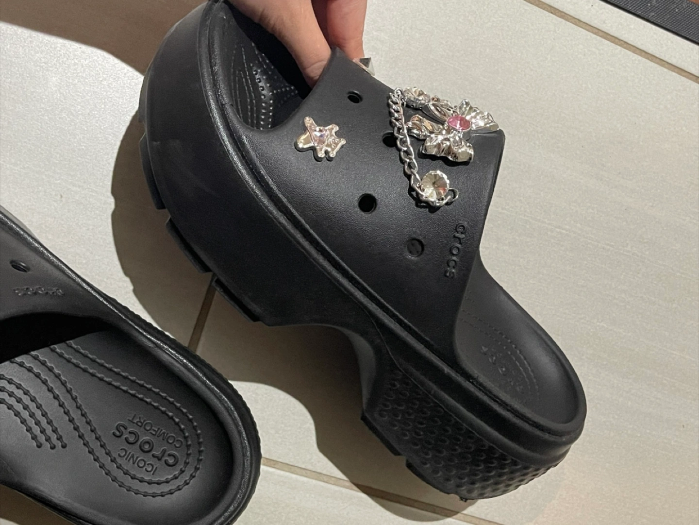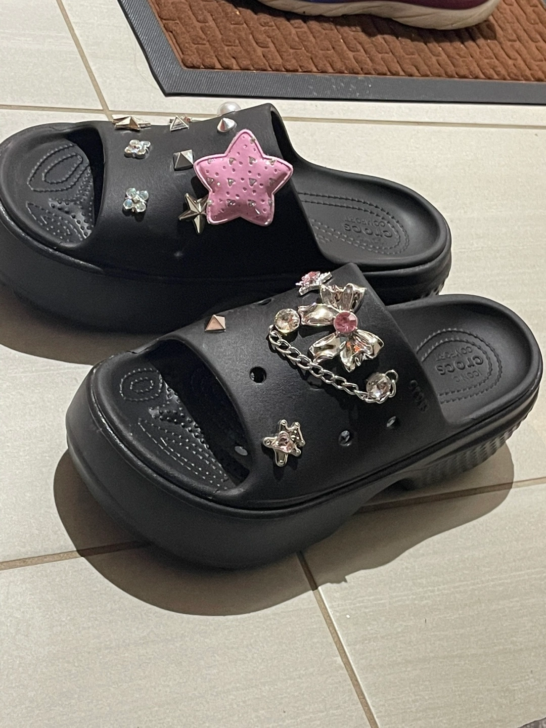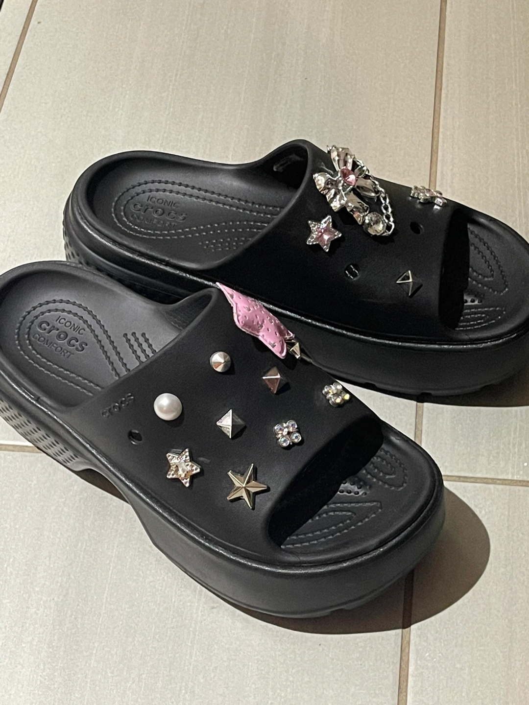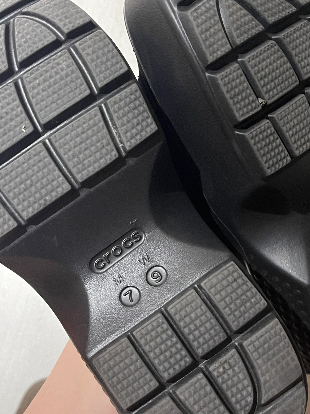 88Selling a pair of black Crocs platform slides in women's size 9 (men's size 7). They have cute jibbitzs on ! Too big again, and too lazy to return.