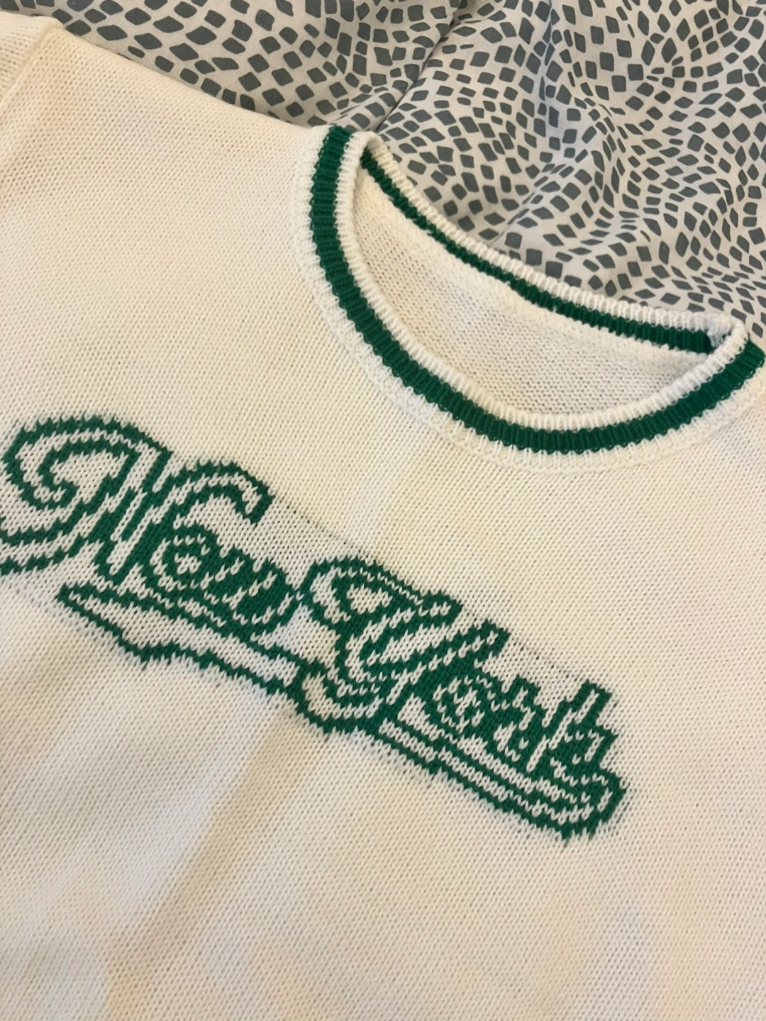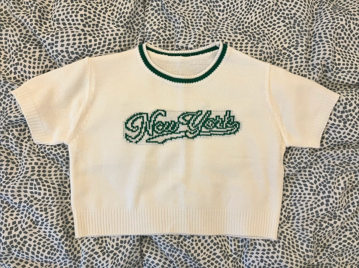 Cropped knit top in white with green neck detail and lettering. Cute and trendy casual style! 📍Pickup available at Sheppard-Yonge or Sherbourne station.