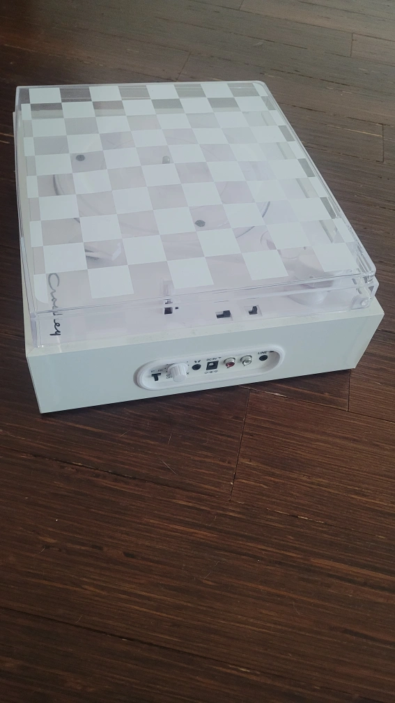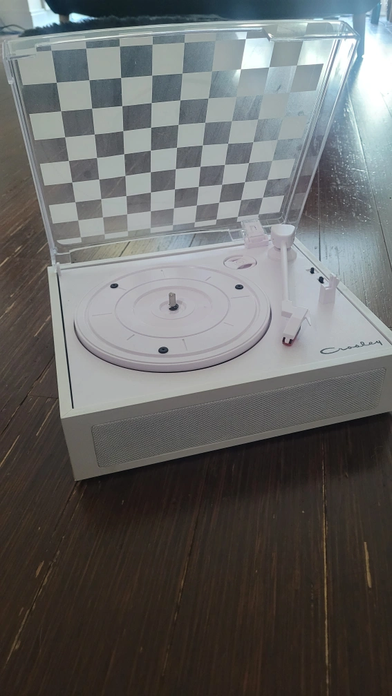 Selling a Crosley Cruiser turntable in white! It's in great condition and has a fun checkered design on the lid. Perfect for playing your favourite vinyl records!