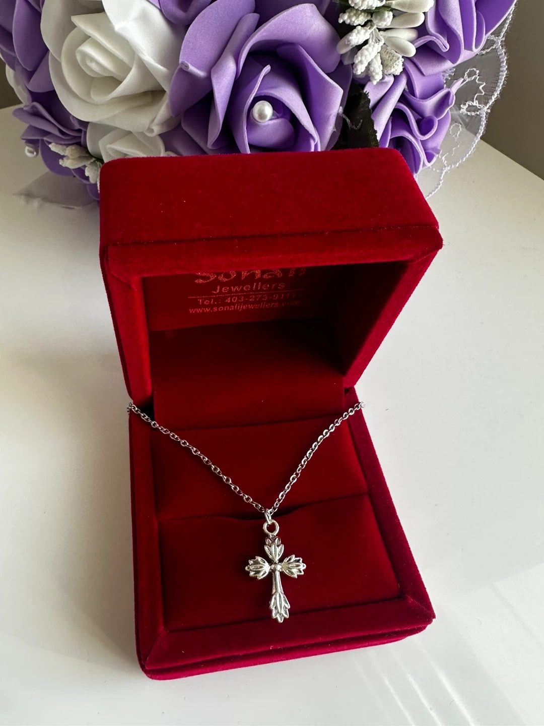 10Selling a lovely cross pendant necklace from It comes in its original red velvet box, perfect for gifting or keeping it safe. The pendant has a delicate design and would make a wonderful addition to any jewelry collection