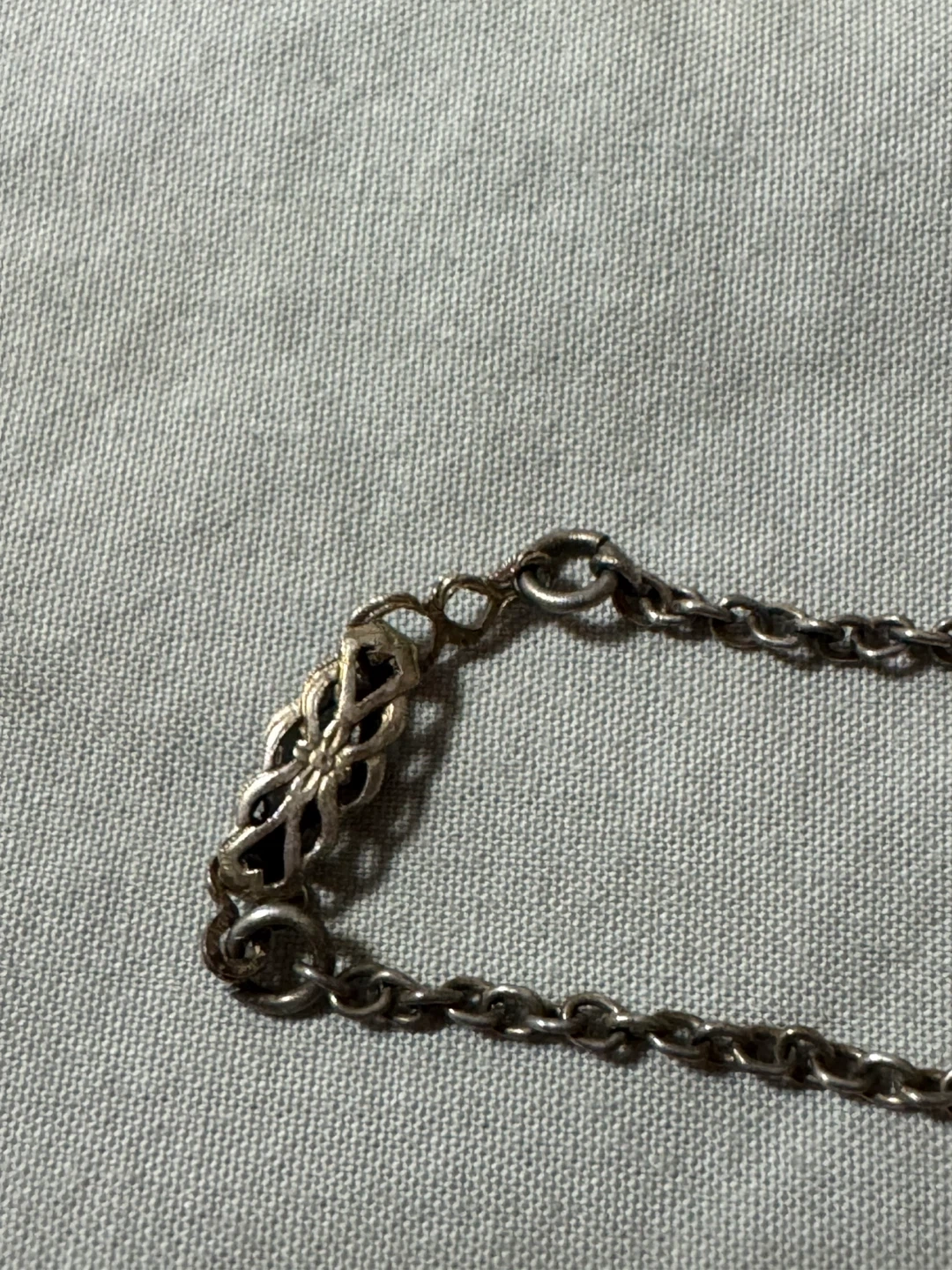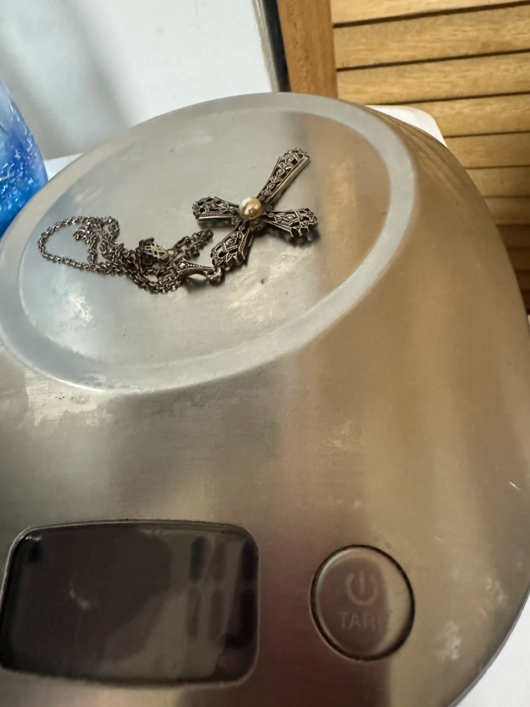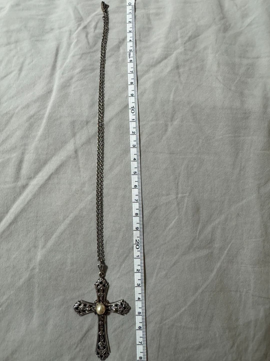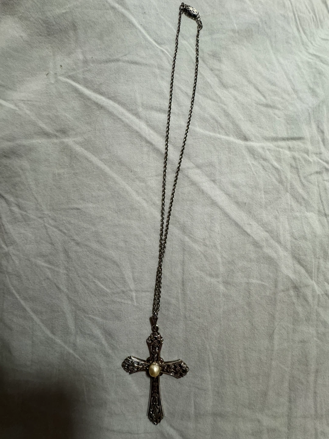 Selling a cross pendant necklace. It features a pearl in the centre of the cross. The chain is included! This piece is sterling silver and a vintage danecraft piece. No stones are missing.