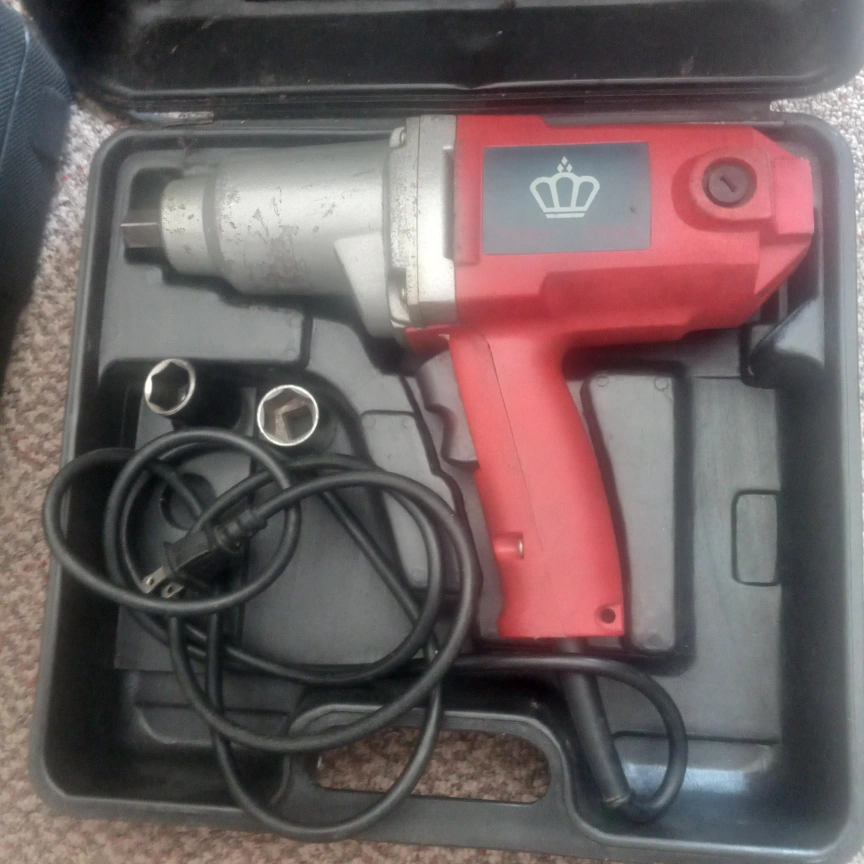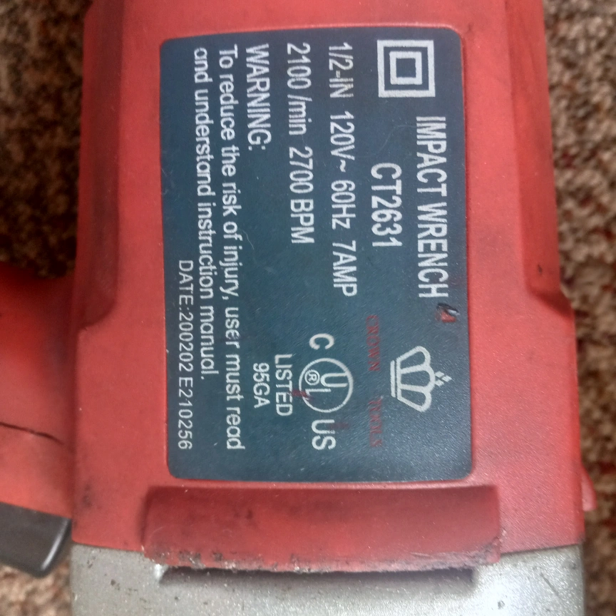 Selling a Crown Impact Wrench model CT2631. It's a 1/2-inch impact wrench, 120V~60Hz 7AMP, and 2100/min 2700 BPM. Comes with the original case and some sockets. Please read the instruction manual before use to reduce the risk of injury