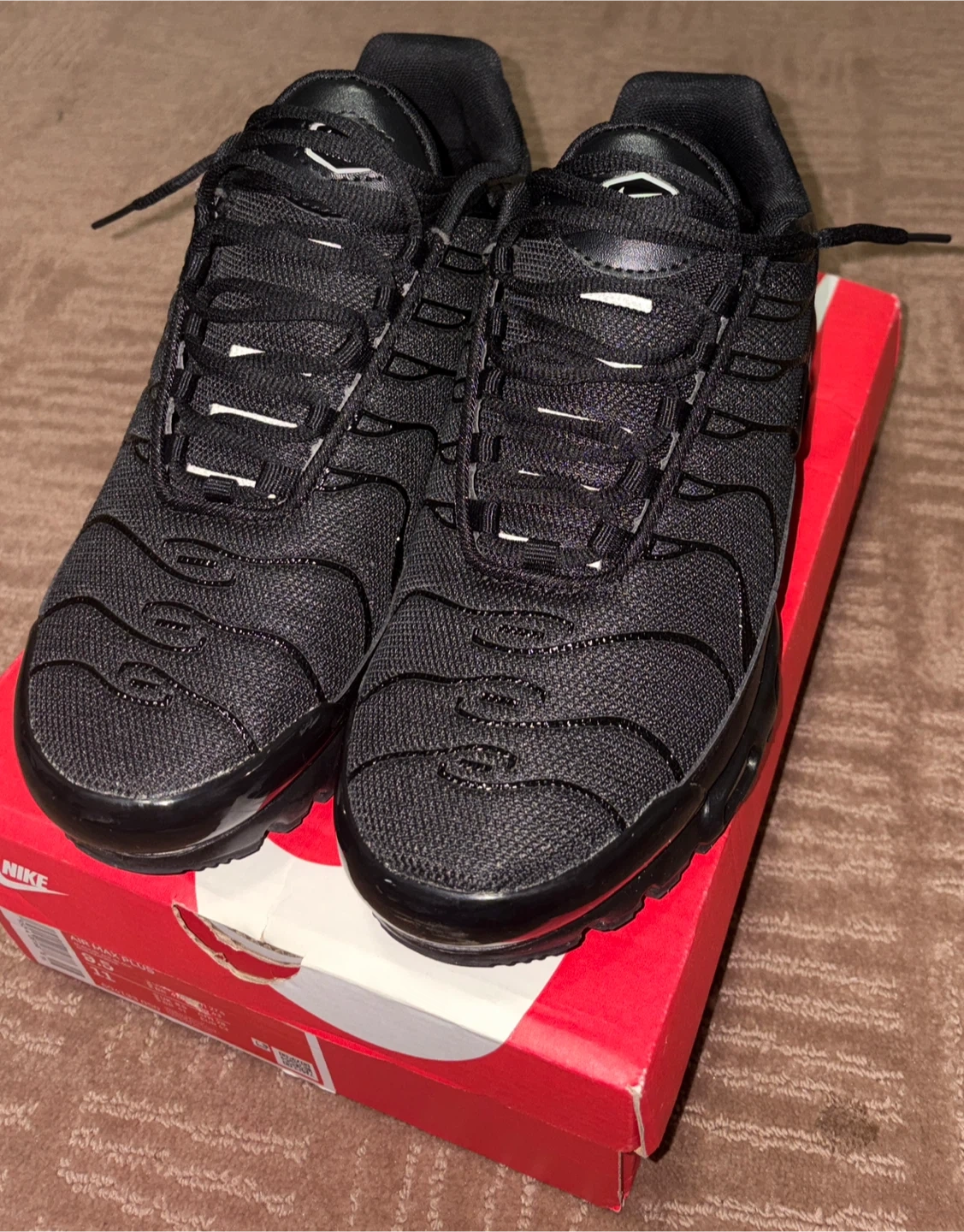 Men's black Nike Air Max Plus TN SE sneakers. Size US 9.5, EUR 43, CM 27.5. Comes with original box. These kicks offer a sleek look with the classic TN Air cushioning.