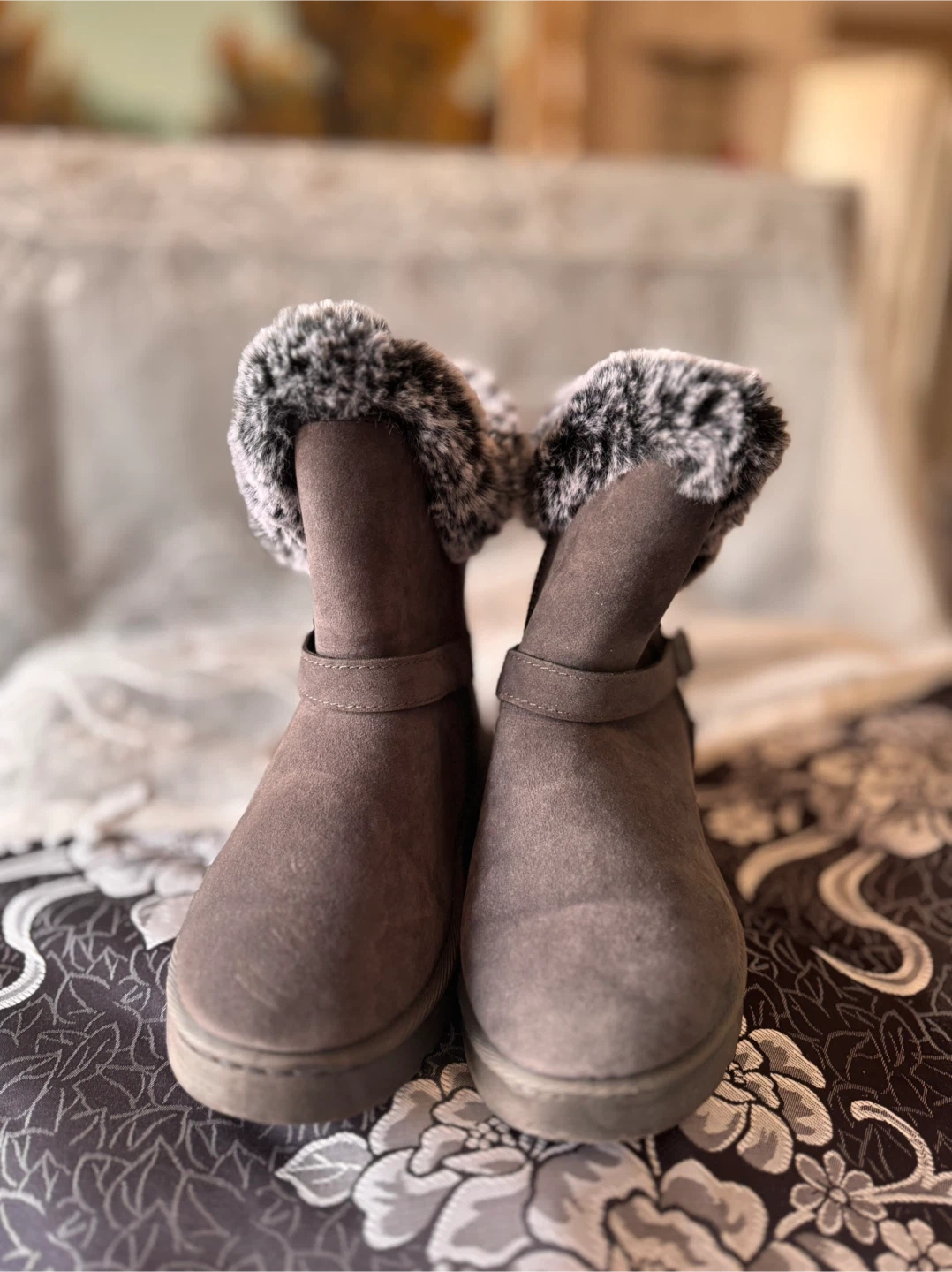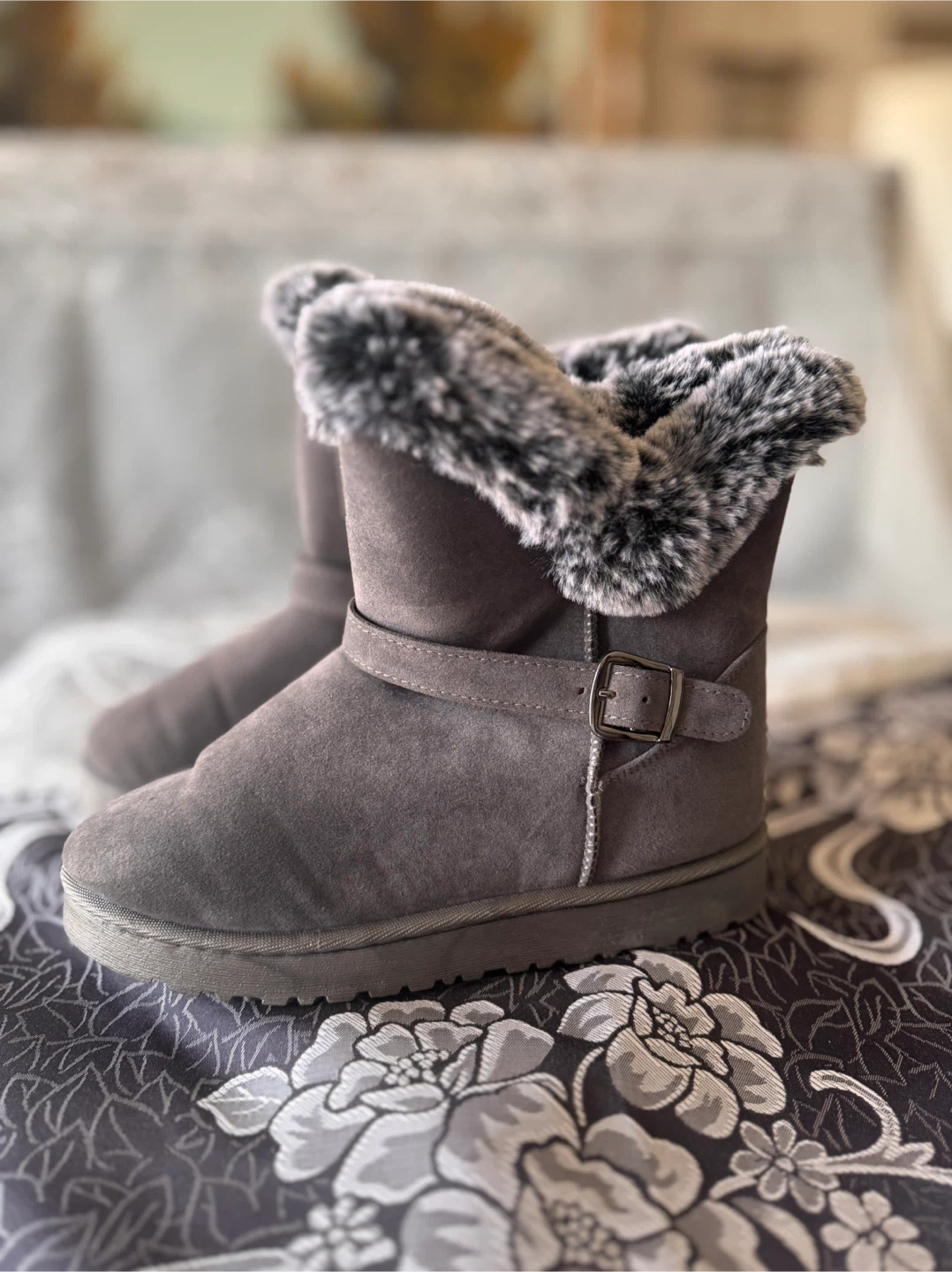Comfy winter boots in a versatile grey colour. They feature a faux suede exterior with a cozy faux fur lining and trim. A buckle strap adds a stylish detail. Perfect for keeping your feet warm during colder months!