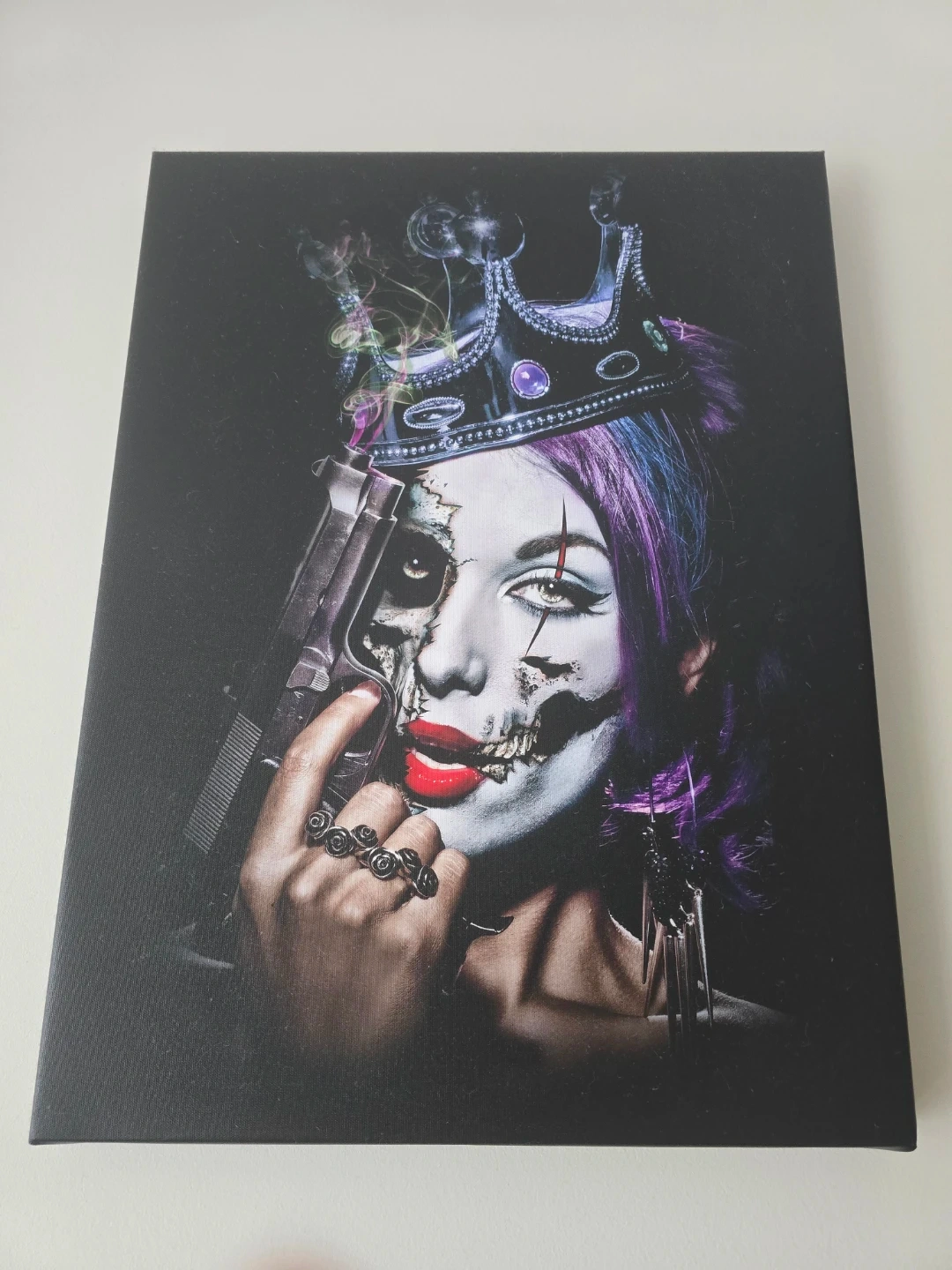 This canvas print features a striking image of a queen with a crown and a gun. It's a bold piece of art that adds a unique flair to any space. Perfect for adding some edgy decor to your home or office!