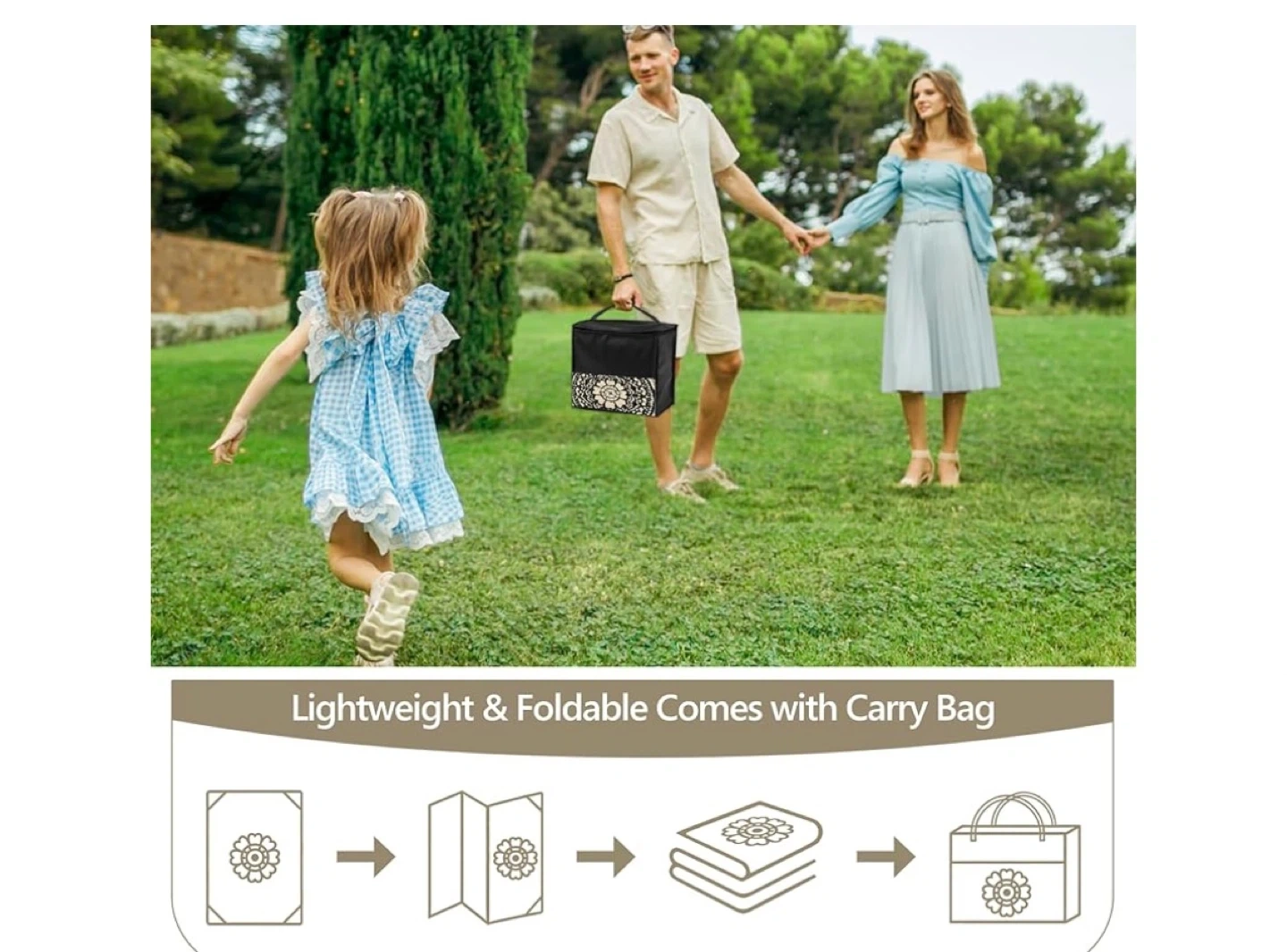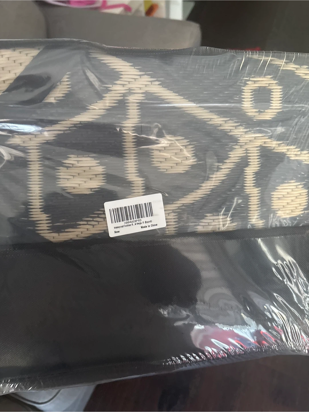 This waterproof and UV resistant round rug is perfect for your patio or deck. It's stylish with a black and beige mandala design. Comes with a carry bag for easy portability! Great for outdoor gatherings.