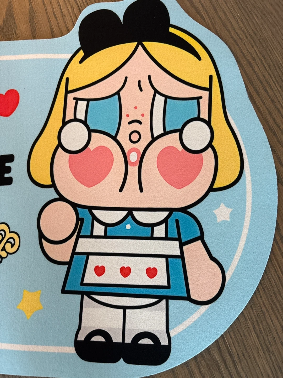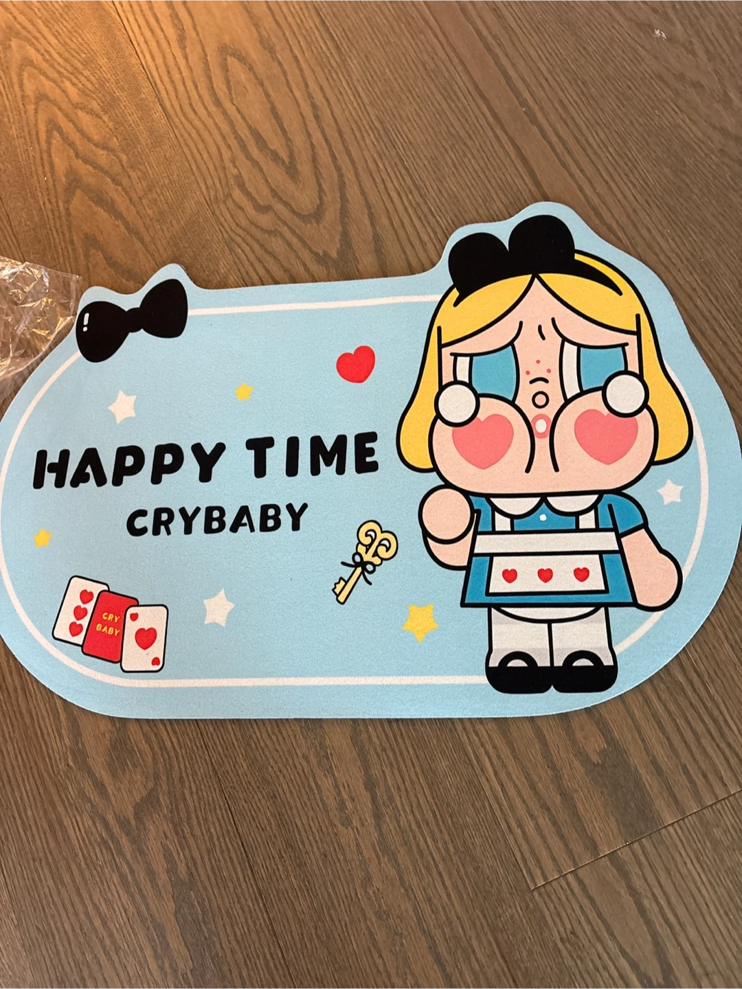 Selling a Crybaby x Alice in Wonderland mat. It's new and would be perfect for a kid's room or for anyone who loves cute decor! The mat features a unique design with Crybaby characters in an Alice in Wonderland theme
