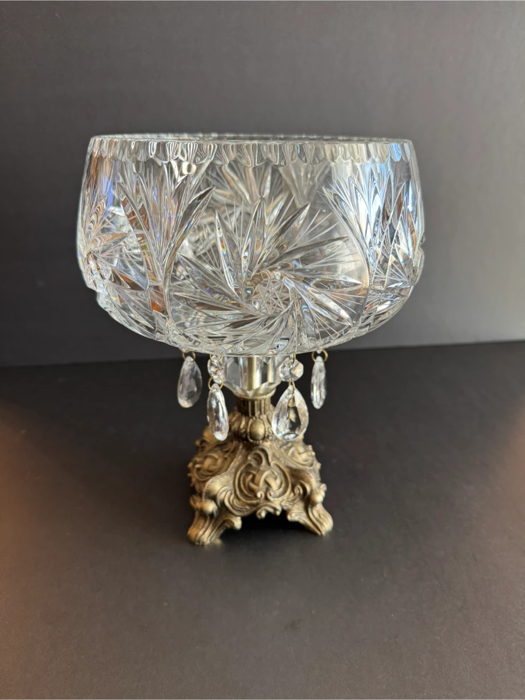 60Selling a beautiful crystal bowl with a brass base. It has a lovely design and would make a great addition to any home decor. High 9.5 inches, Diameter 7 inches