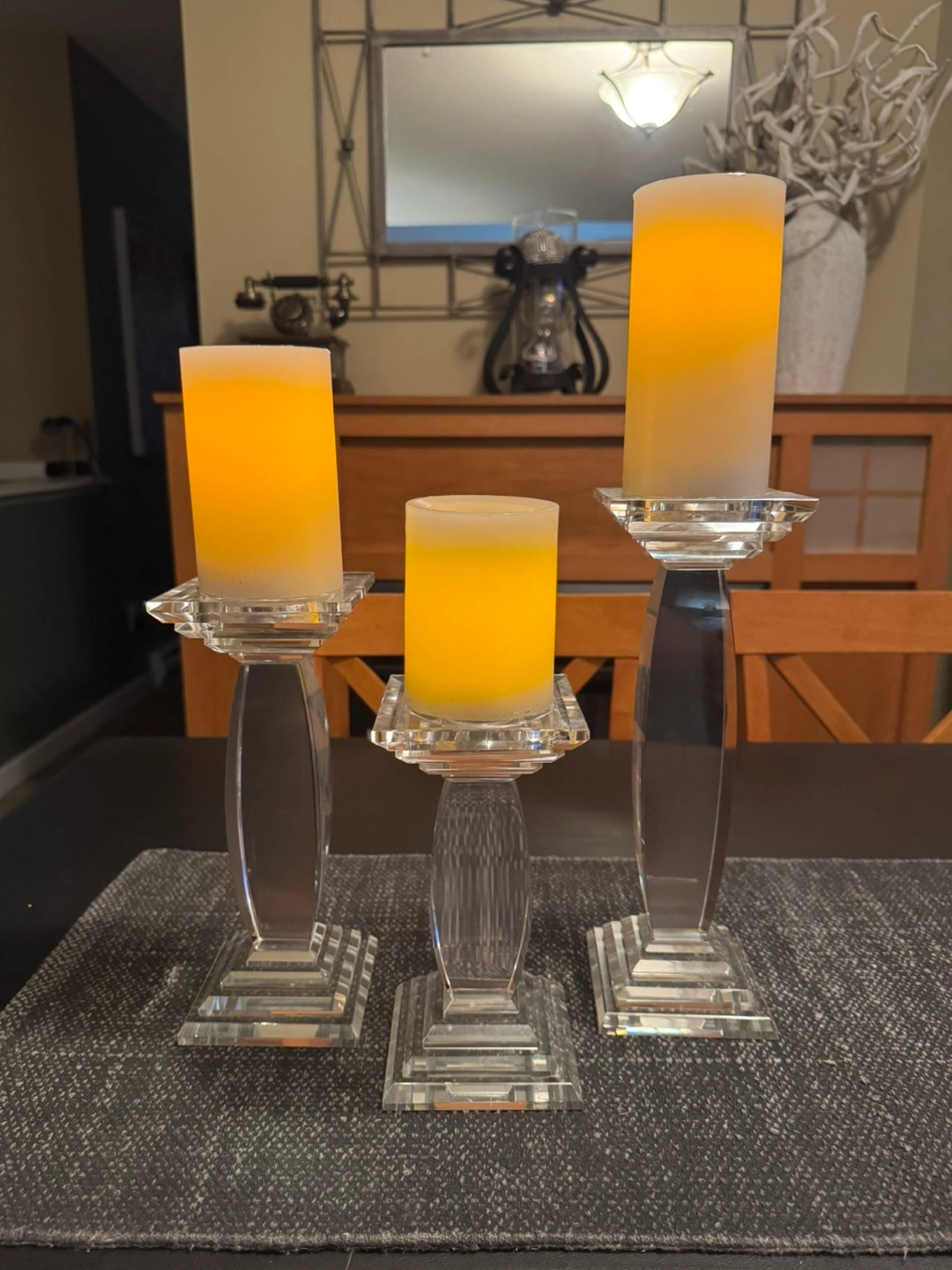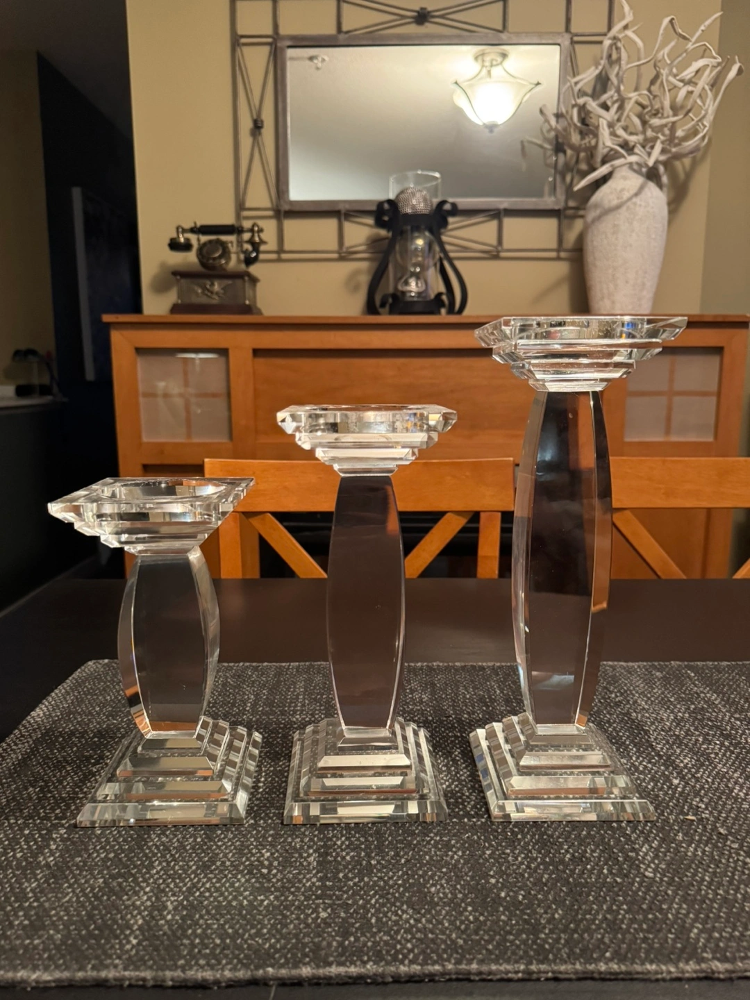 46Made from genuine crystal, these crystal candle holders sparkle beautifully and create a timeless ambiance. Perfect for any dining table, mantle, or special occasion decor. Heights: Approximately 12”, 10”, and 8” Excellent condition, no chips or scratches Ideal for pillar candles (approximately 3” opening) Selling as a set. Pickup in Langley. Price: $70 for the set. Let me know if you’re interested or have any questions!