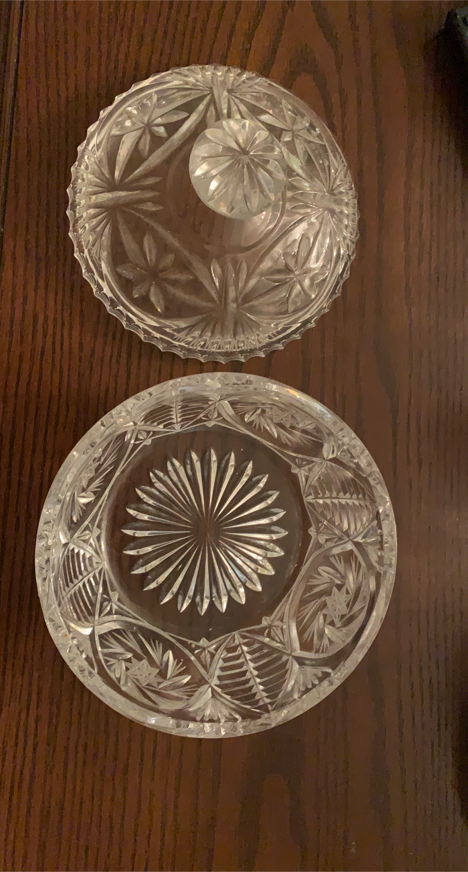 46Selling a lovely crystal candy dish with a matching lid. The intricate design catches the light beautifully, adding a touch of elegance to any room. It's in great condition and ready to be displayed or used for your favourite treats