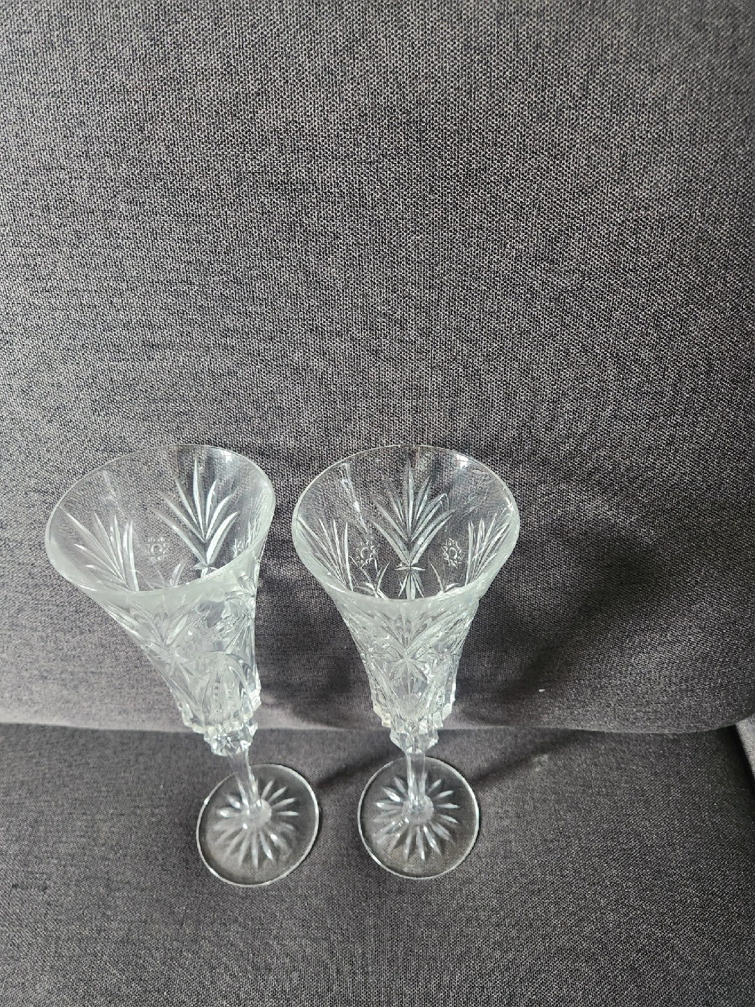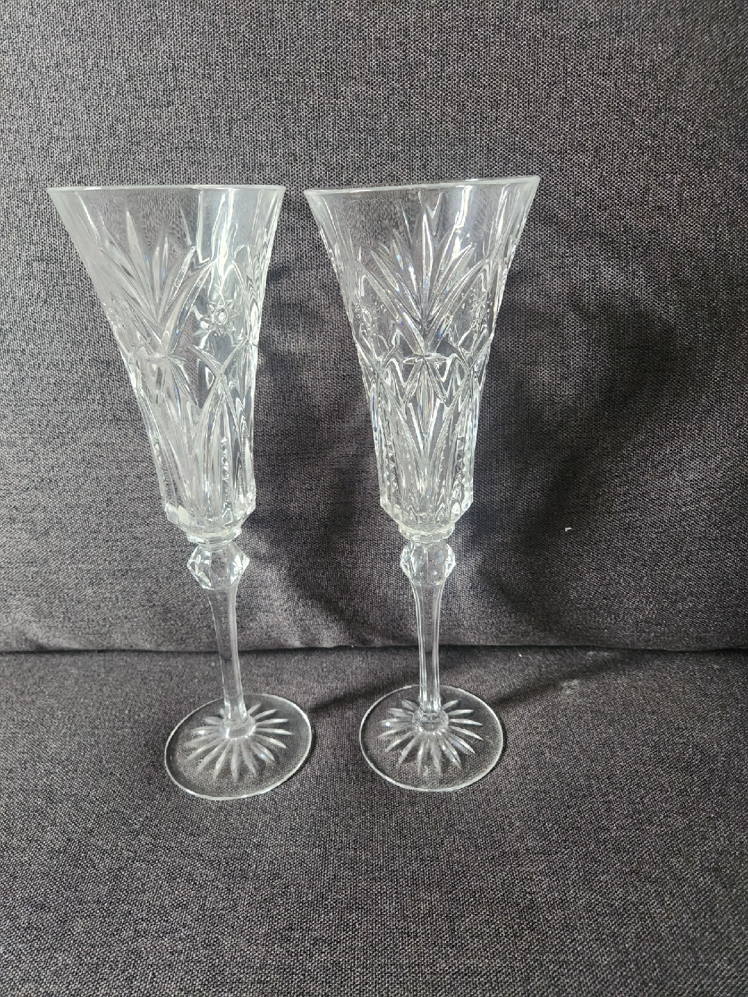 Selling a set of two beautiful crystal champagne flutes. These are perfect for celebrations or adding a touch of elegance to your home. They feature a lovely etched design. Great condition!