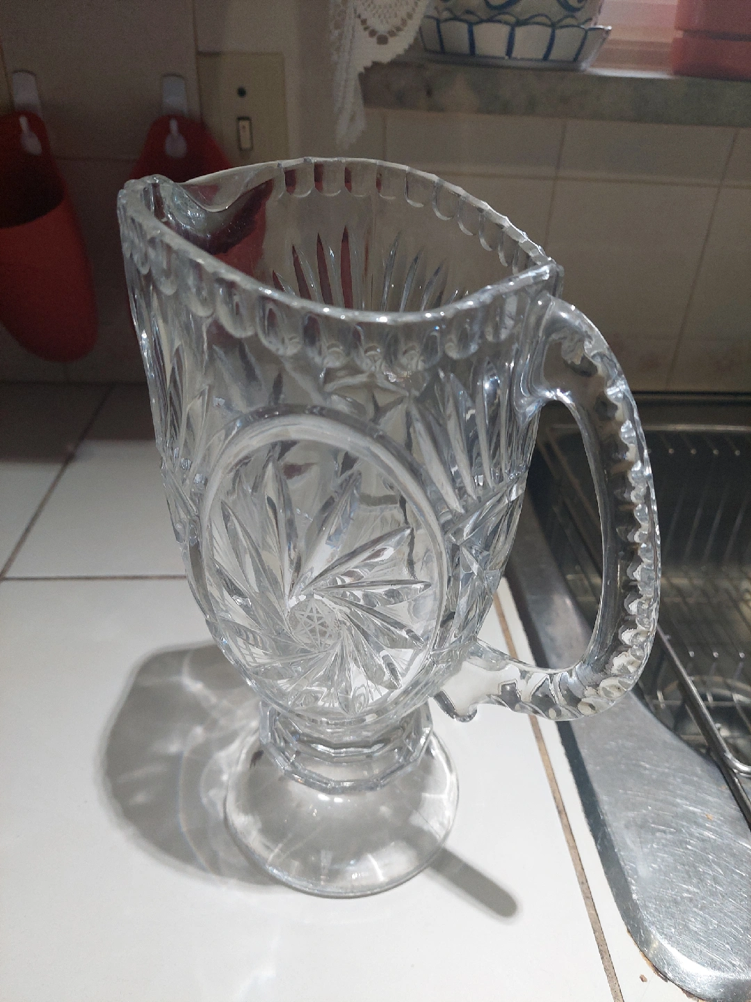10Selling a beautiful crystal glass pitcher. Can be used for wine. It has a lovely design and would look great on any table!