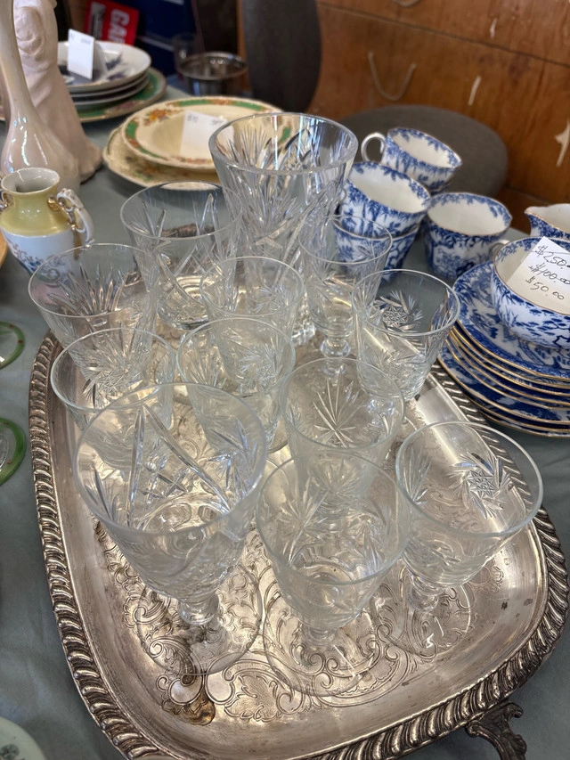 This elegant collection of crystal glassware, features intricately cut patterns that catch the light beautifully. This assortment includes stemmed glasses, tumblers, and a small carafe, perfect for adding a touch of sophistication to any dining occasion. These glasses have been well cared for and are in good condition, ready to enhance your table setting or home bar. * Elegant crystal design * Mix of stemmed and non-stemmed glasses * Small carafe included Priced for quick sale at $65.00, it's a steal for this beautiful set.