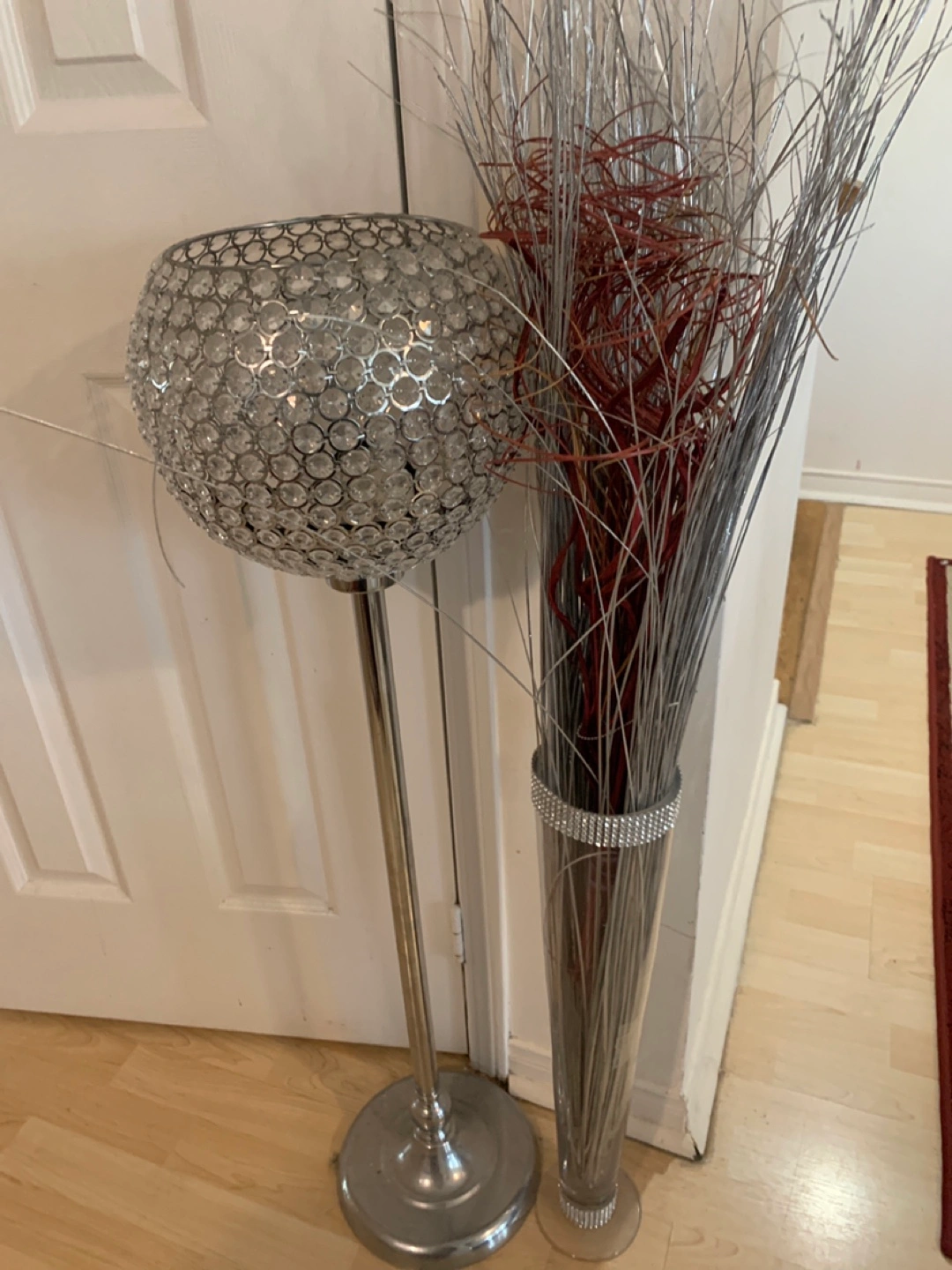 Elegant silver decorative crystal globe. Tall clear glass vase with decorative band, filled with burgundy and silver artificial branches. Perfect for adding a touch of glamour to any room.