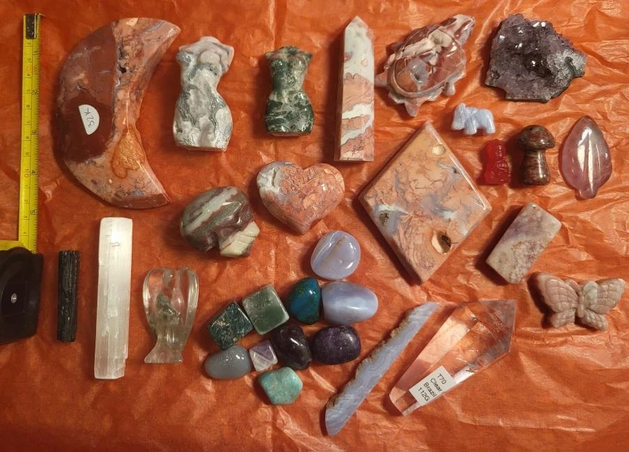 A collection of unique crystals that include: Cotton Candy Agate Moon, Heart, Tower, Diamond and Turtle, Moss Agate Goddess Bodies and Tumbles, Sleniteand Black Tourmaline, Amethyst Crust and Pink Ammy Free Form, High Quality Clear Quartz Scepter, Jasper Skull, Blue Lace Agate Yak and Tumbles, Fluorite Feather, Garden Quartz Angel etc. Easily $225+ Value. Low Ball Offers will not be entertained. Pick up South Barrie. Cheers.