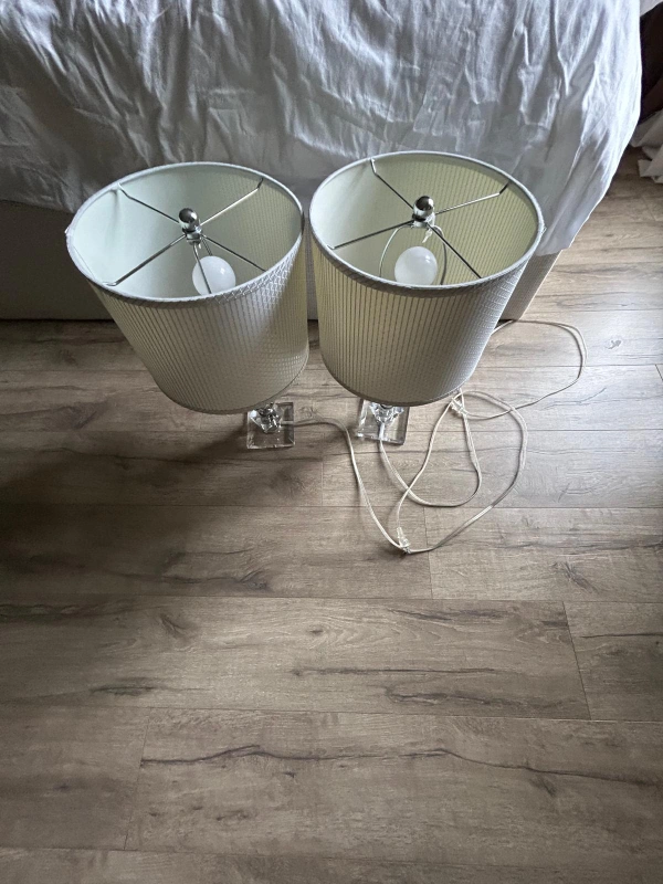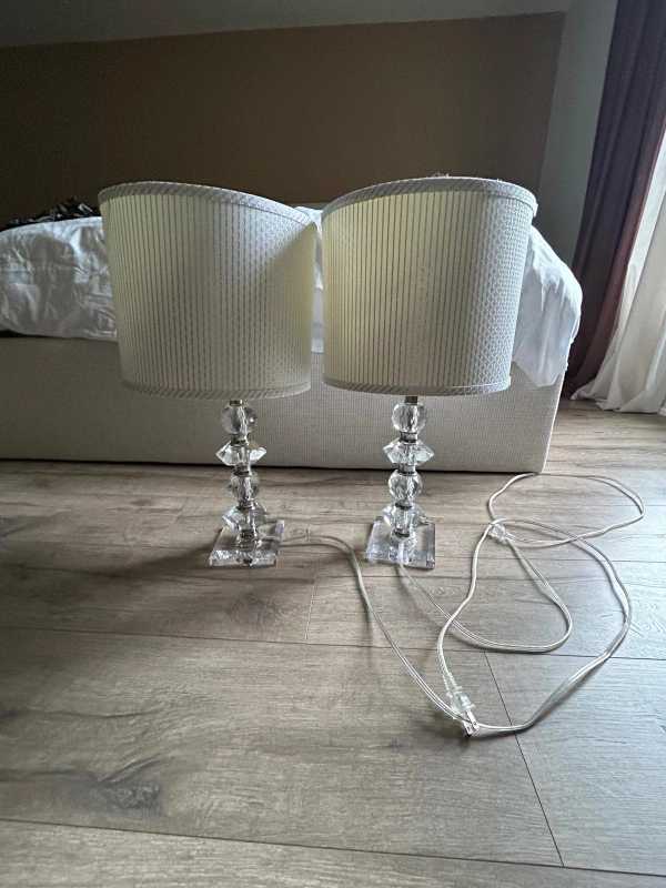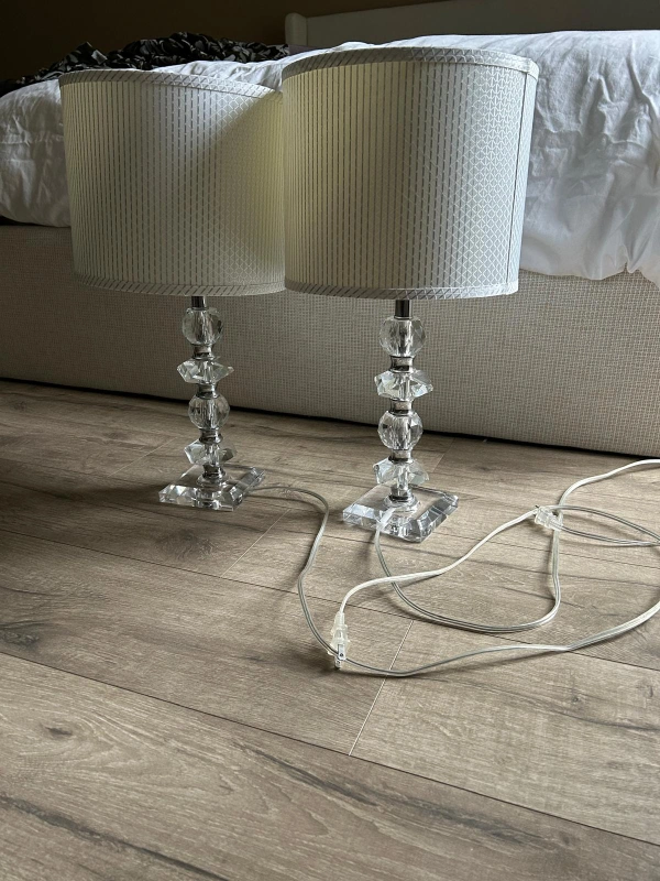 Selling a set of two beautiful crystal table lamps! They feature a square base, crystal accents, and a neutral-toned shade. These lamps would add a touch of elegance to any room!