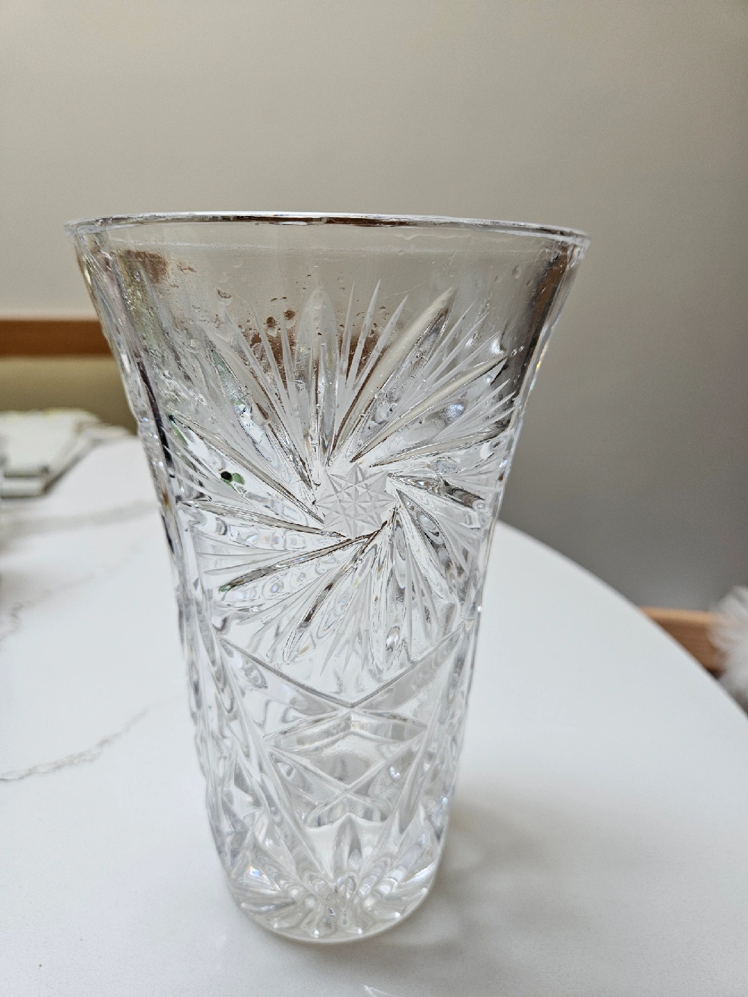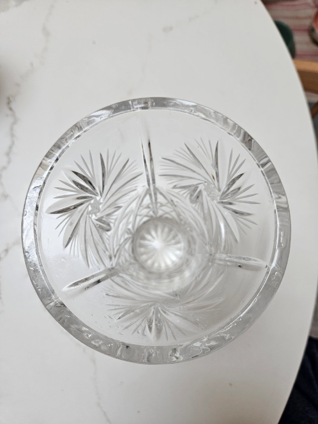 Add a touch of elegance to your home with this beautiful crystal vase! It features a stunning starburst pattern and a classic design. Perfect for displaying your favourite flowers or as a decorative piece on its own. It's in great condition and ready to brighten up any room 8 inch tall 5 inch opening