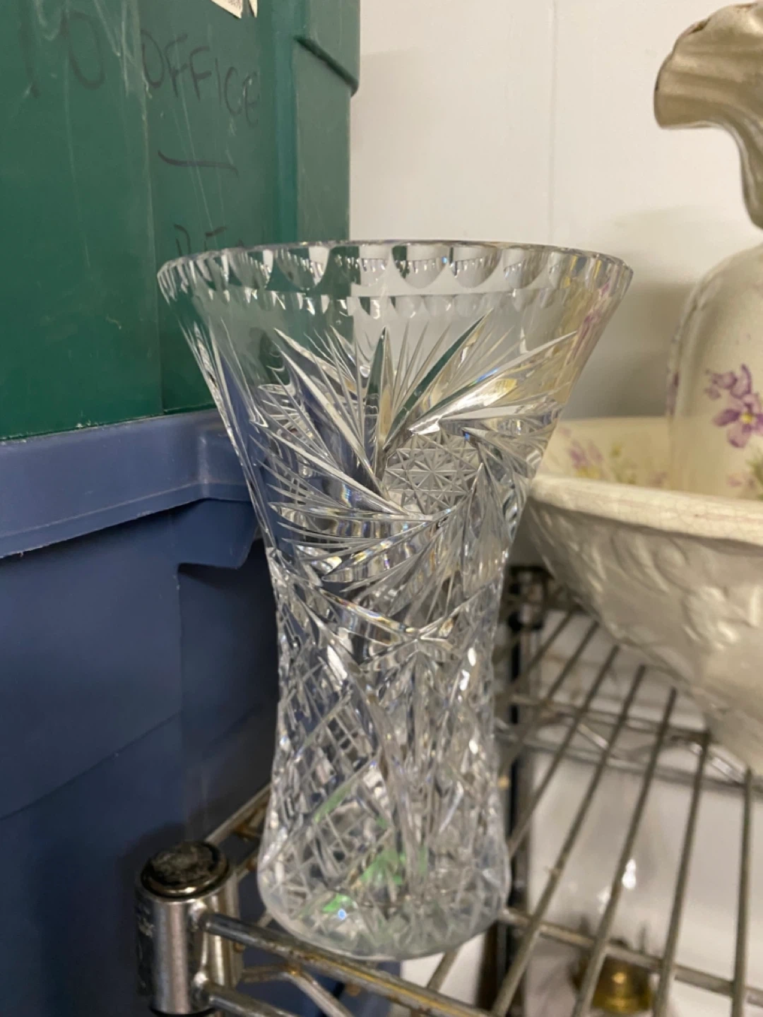 Selling a beautiful good sized crystal vase. It features an intricate starburst pattern and would look lovely with flowers or as a decorative piece on its own. It's in great condition and ready for a new home