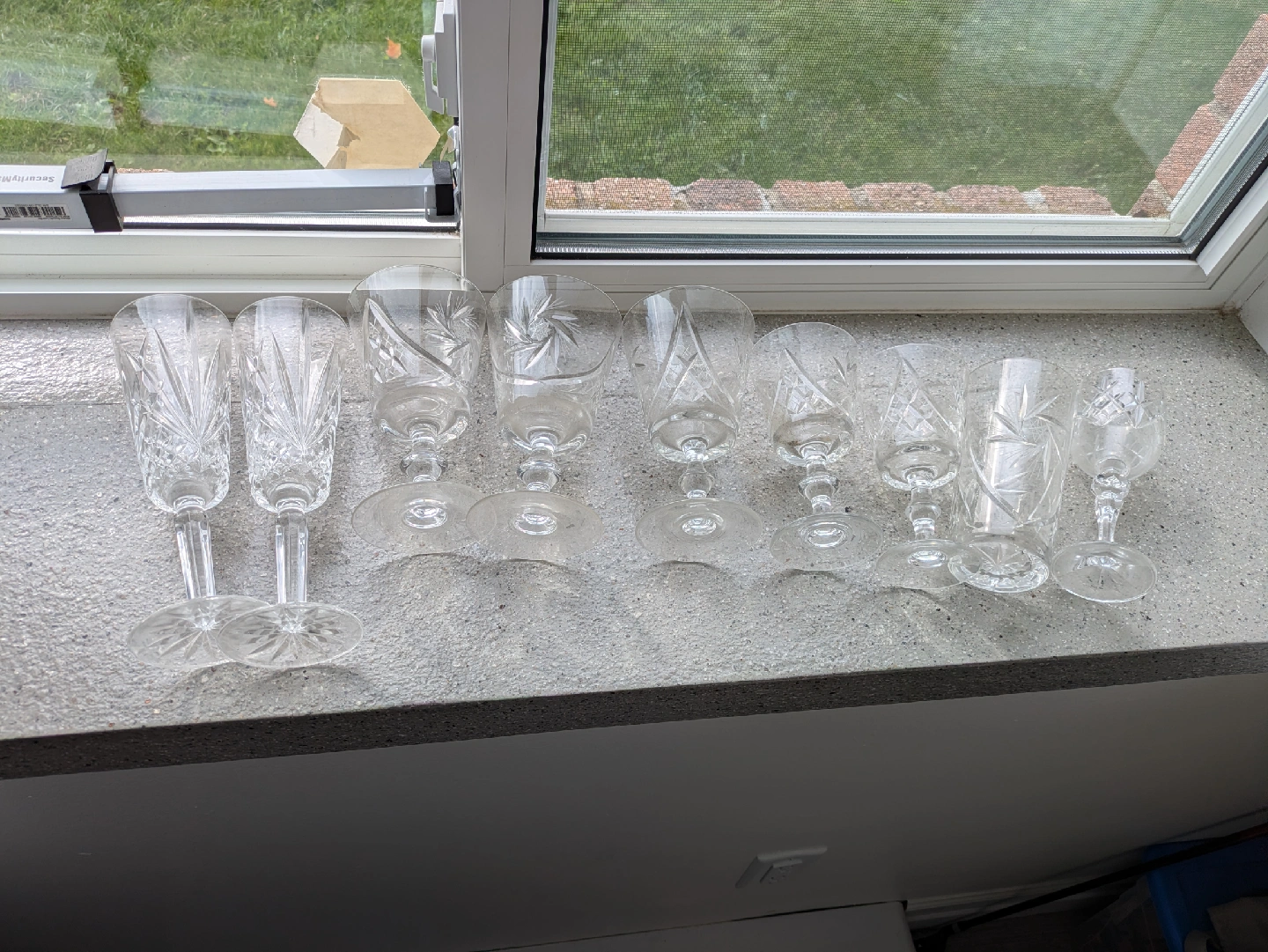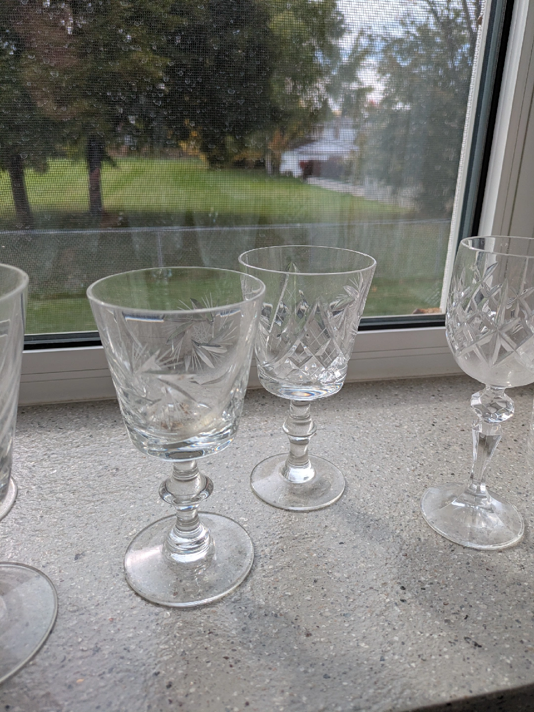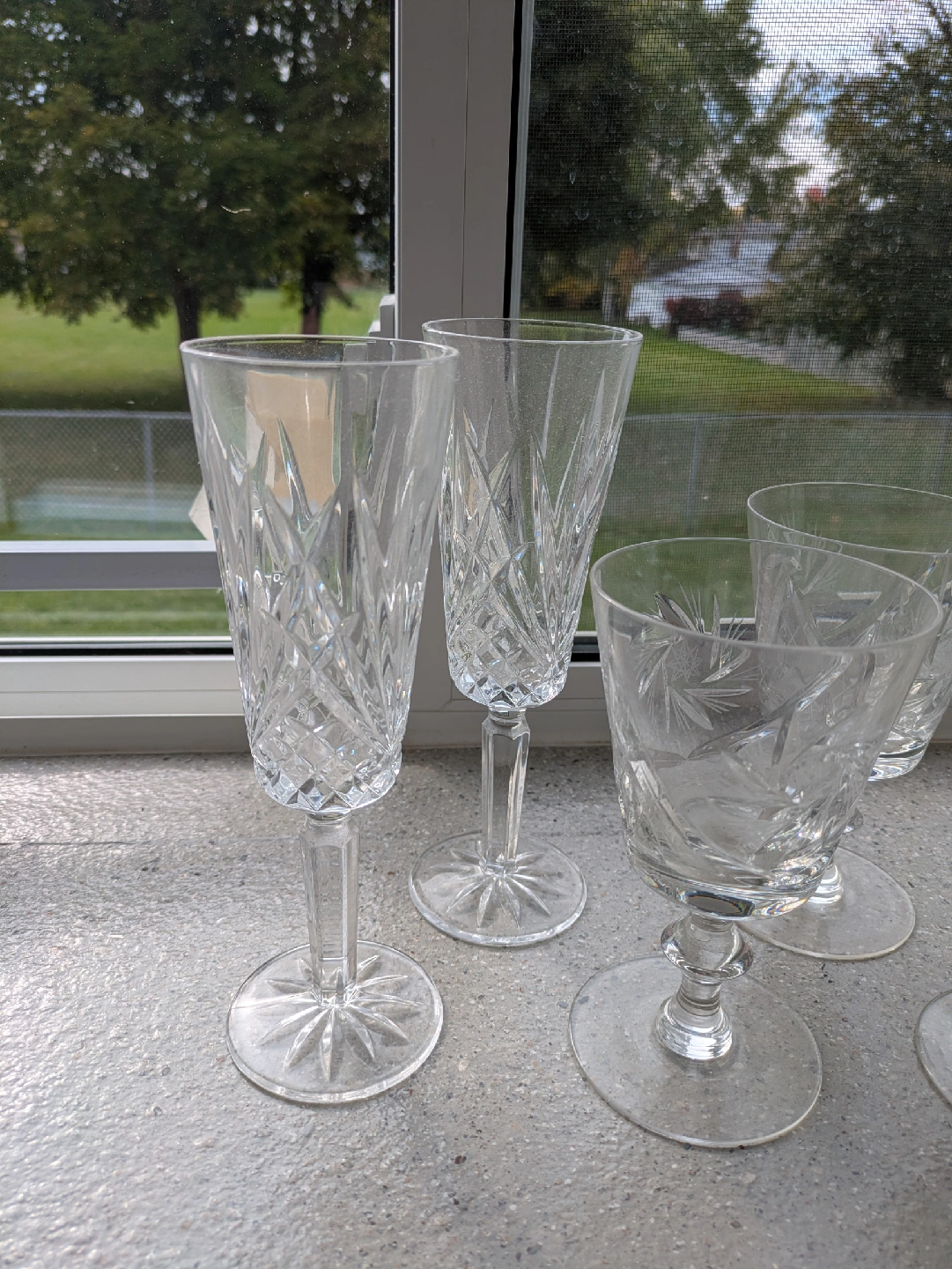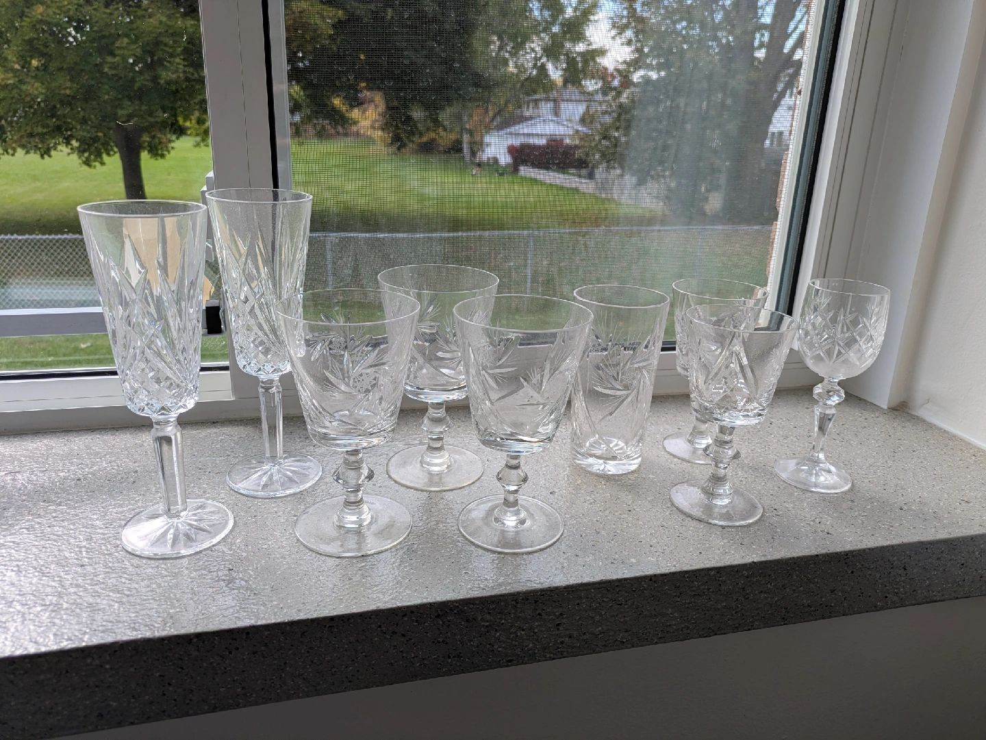 12Selling a set of nine beautiful crystal glasses! There are several different styles, perfect for wine or champagne. They're in great condition and ready for a new home