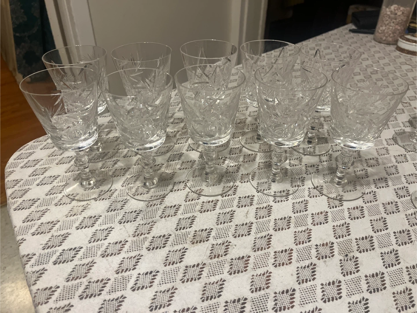 Selling a set of 10 beautiful crystal wine glasses! They have a lovely, intricate pattern and are perfect for adding a touch of elegance to any occasion. They are in great condition and ready for a new home