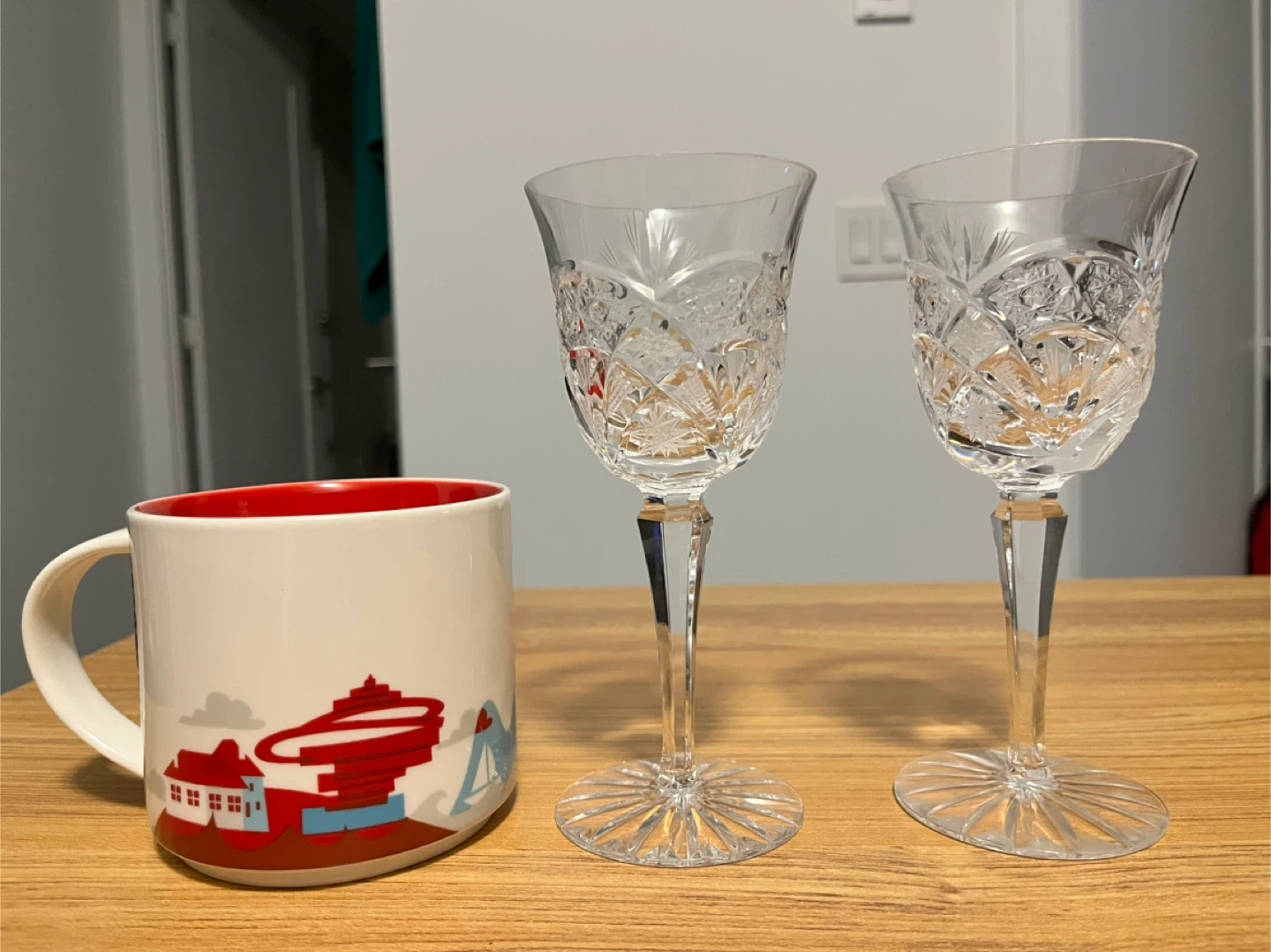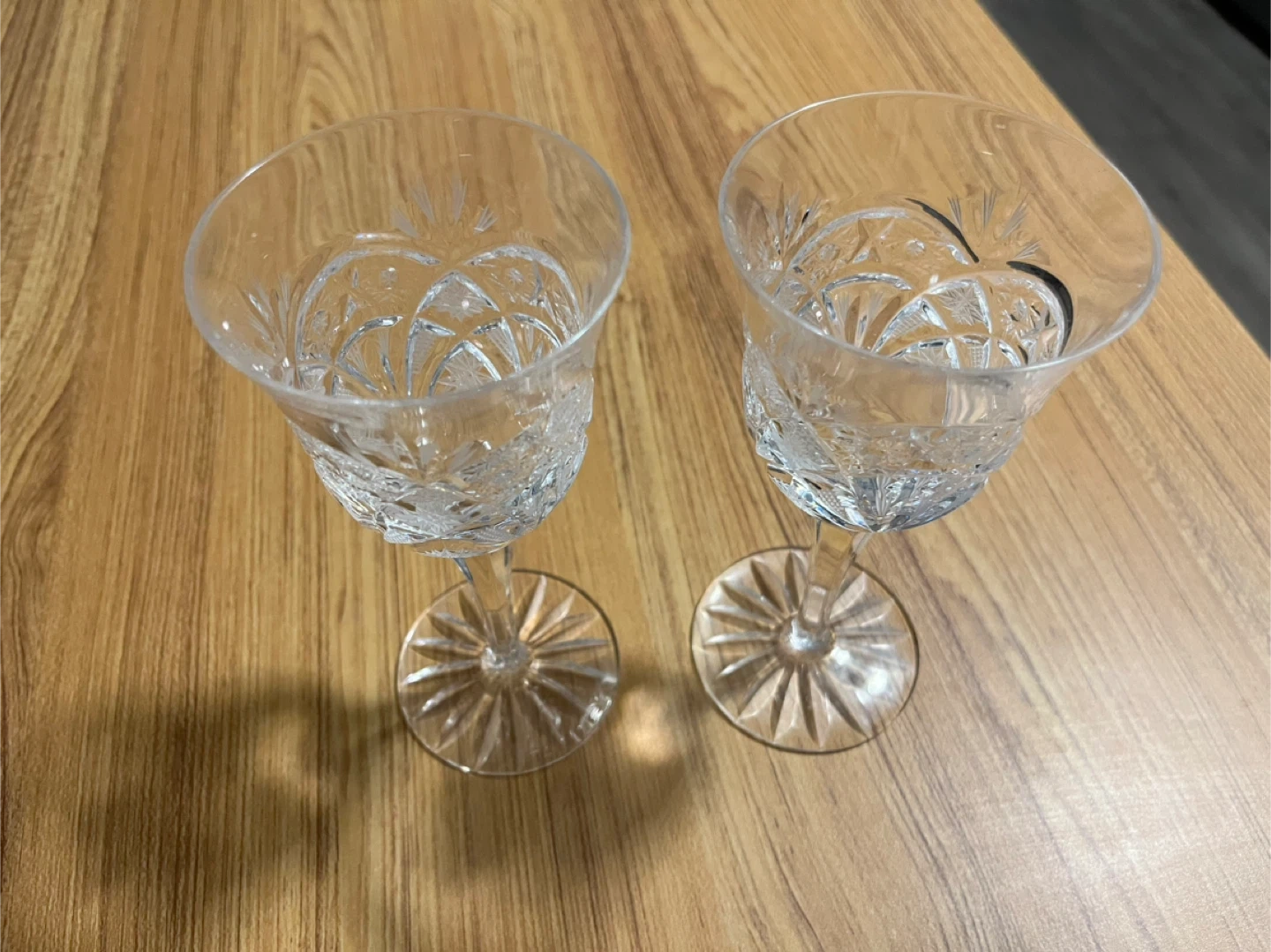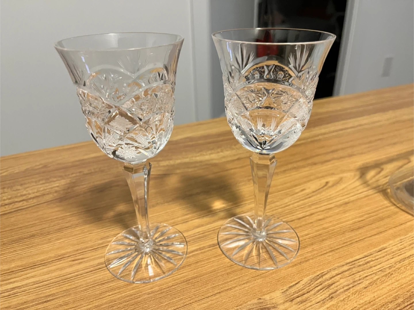 Selling a set of two beautiful crystal wine glasses! These glasses feature an intricate cut-glass design and are in great condition. Perfect for adding a touch of elegance to your next dinner party or special occasion Hardly used, almost new. The Starbucks mug is used to compare the size