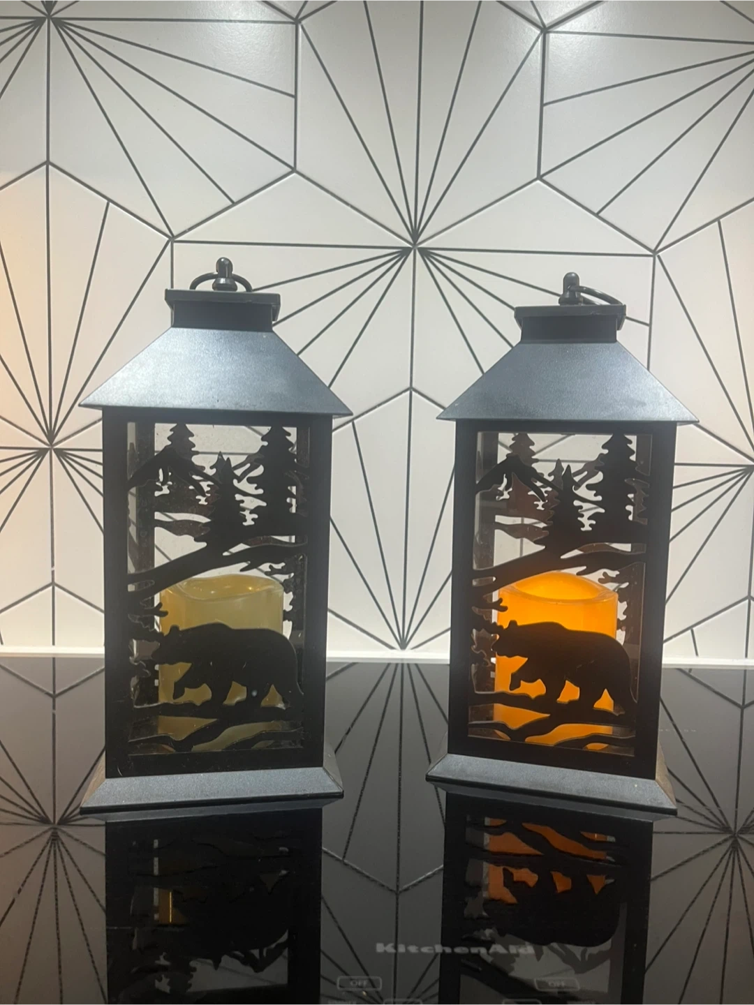 Two decorative black metal lanterns featuring a bear and tree silhouette design. Each lantern contains a battery-operated LED candle Requires 2 AA batteries per lantern.